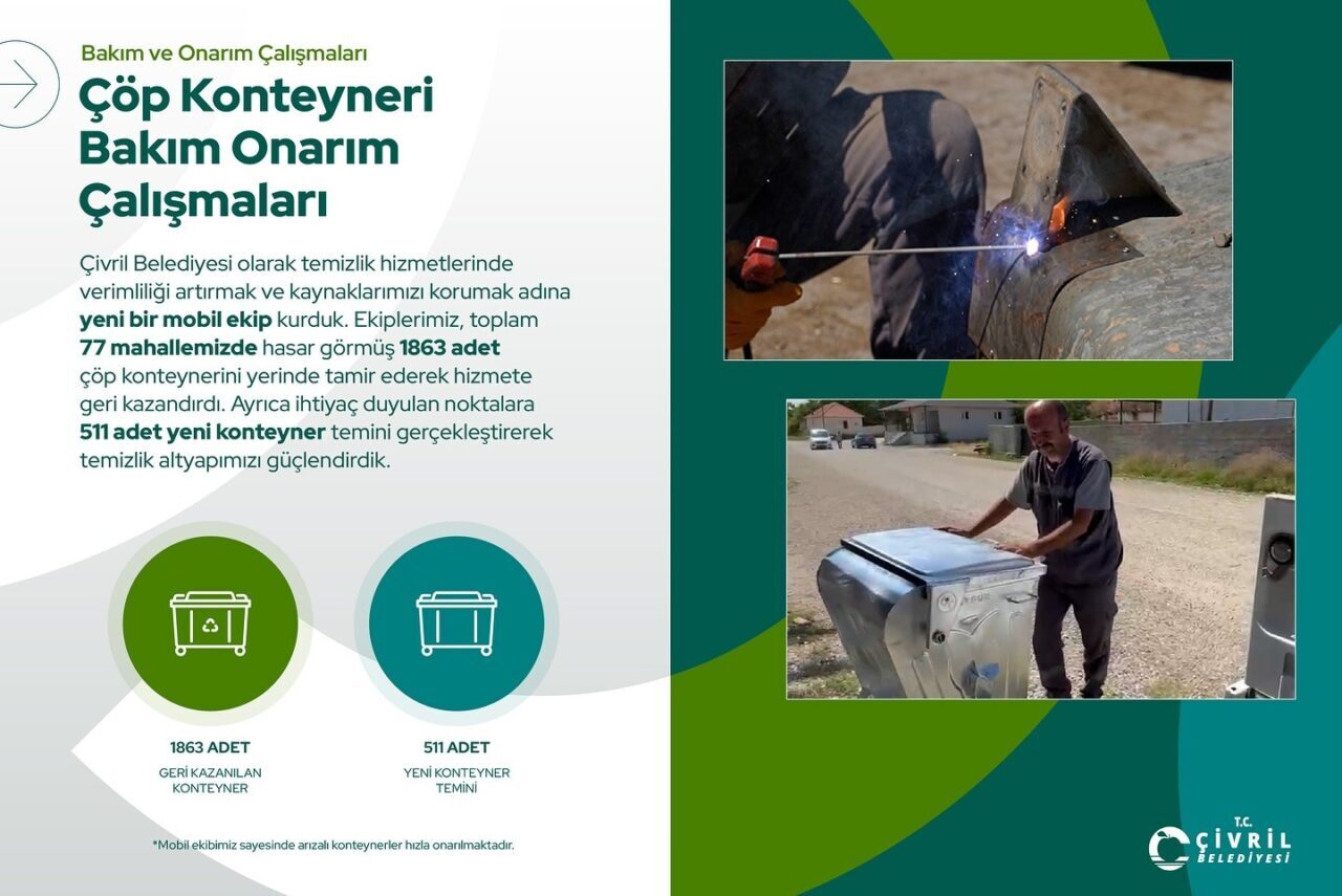 Temizlik hizmetlerinde verimliliği artırmak ve kaynakları korumak adına yeni bir mobil ekip kurduklarını ifade eden Çivril Belediye Başkanı Semih Dere; “Çivril Belediyesi olarak temizlik hizmetlerinde verimliliği artırmak ve kaynaklarımızı korumak adına yeni bir mobil ekip kurduk. Ekiplerimiz, toplam 77 mahallemizde hasar görmüş bin 863 adet çöp konteynerini yerinde tamir ederek hizmete geri kazandırdı. Ayrıca ihtiyaç duyulan noktalara 511 adet yeni konteyner temin ederek temizlik altyapımızı güçlendirdik” dedi.