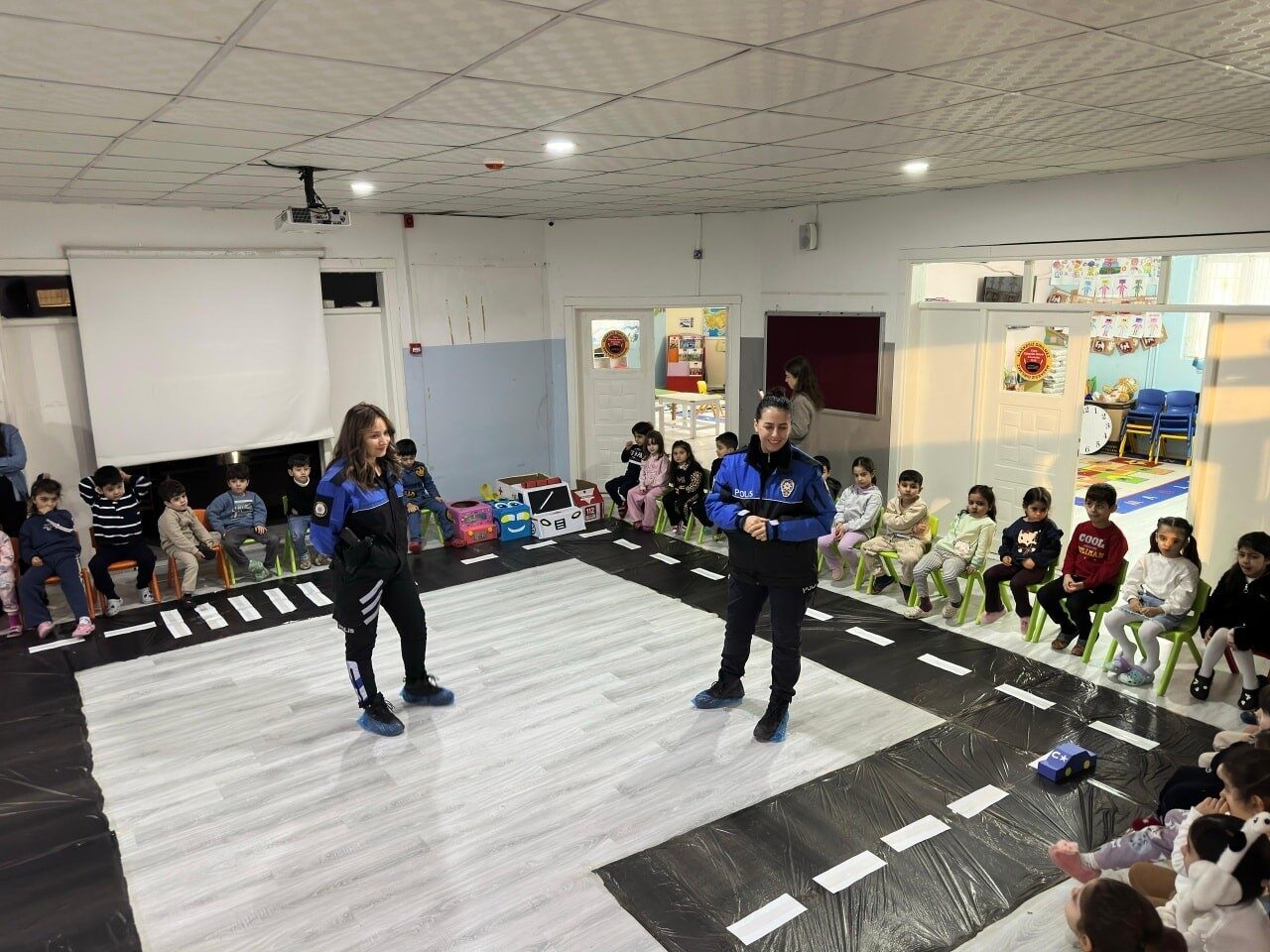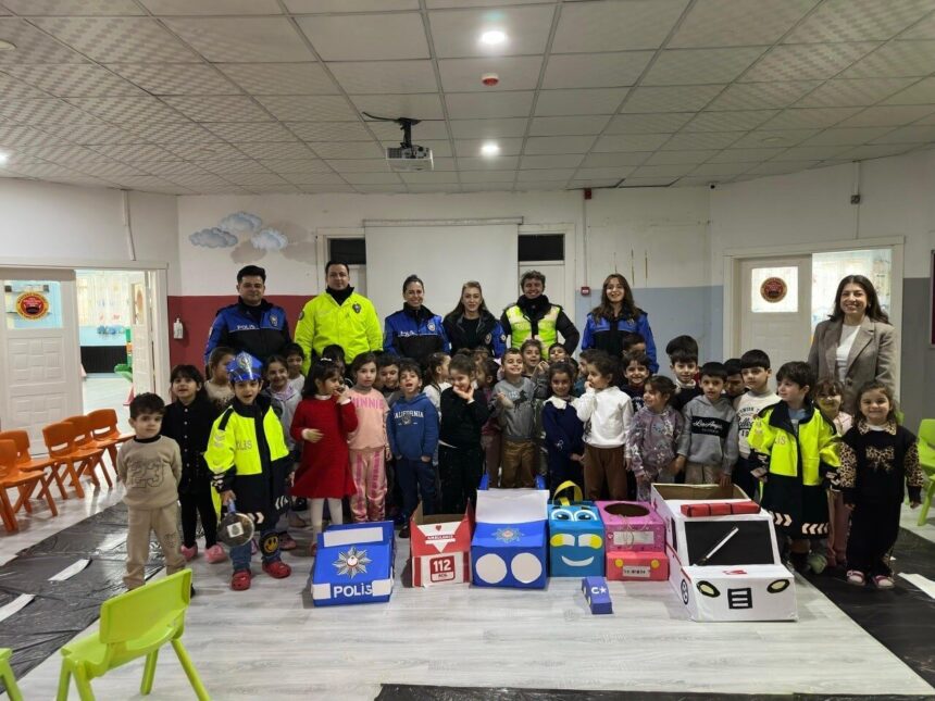 Toplum Destekli Polislik Büro Amirliği ile Trafik Tescil ve Denetleme Büro Amirliği ekipleri, Zübeyde Hanım Anaokulunu ziyaret ederek polislik mesleği, genel güvenlik kuralları ve trafik bilinci konularında öğrencilere bilgi verdi. Etkinlik kapsamında öğrencilerle eğitici trafik uygulaması gerçekleştirilirken, temel trafik işaretleri ve güvenli yaya davranışları uygulamalı olarak anlatıldı. Polis ekipleri, minik öğrencilerle birebir sohbet ederken, onların merak ettiği soruları yanıtladı ve güvenli yaşam farkındalığını artırdı.