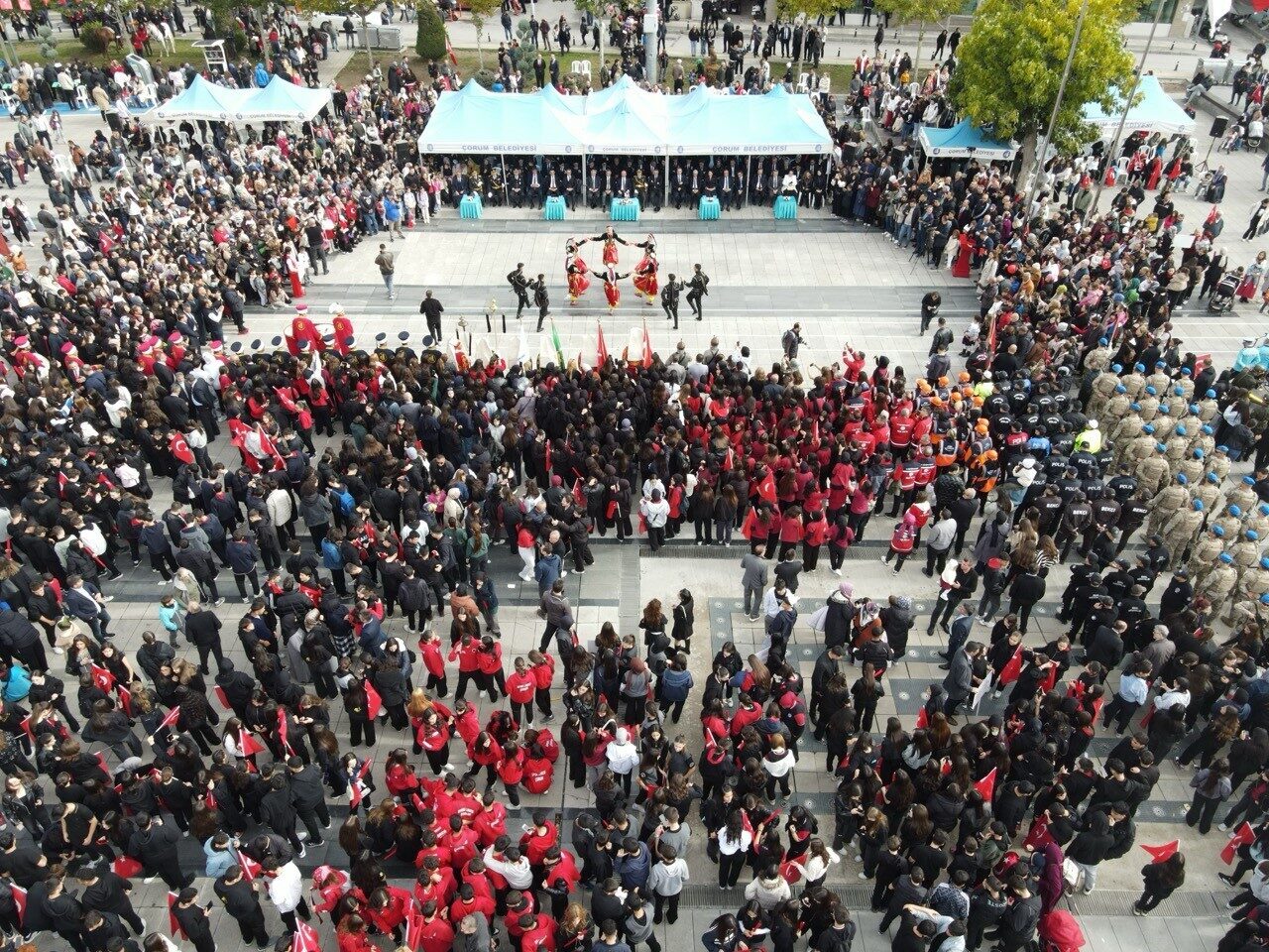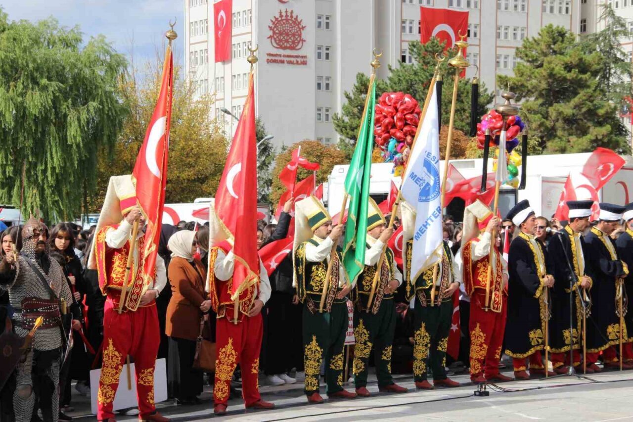 Törende ayrıca Cumhurbaşkanı Recep Tayyip Erdoğan’ın mesajı da katılımcılara iletildi. Program, öğrenci şiirleri, halk dansları ve Çorum Belediyesi Mehter Takımı ile Bando Takımı gösterileriyle devam etti. Resmi tören geçişinin ardından bayram kutlamaları sona erdi.