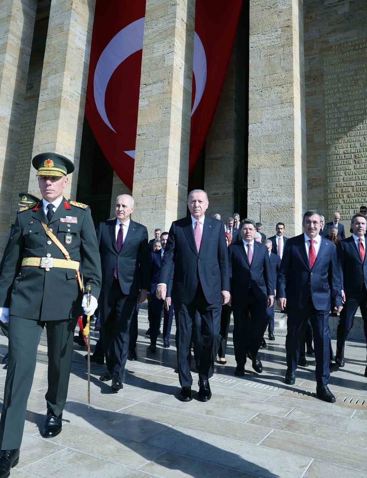 Cumhurbaşkanı Erdoğan, beraberinde Türkiye Büyük Millet Meclisi (TBMM) Başkanı Numan Kurtulmuş, Cumhurbaşkanı Yardımcısı Cevdet Yılmaz, Cumhuriyet Halk Partisi (CHP) Genel Başkanı Özgür Özel, Milliyetçi Hareket Partisi (MHP) Genel Başkanı Devlet Bahçeli ve Cumhurbaşkanlığı Kabinesi üyeleri ile birlikte Aslanlı Yol’dan geçerek, üzerinde ay yıldız bulunan çelengi Gazi Mustafa Kemal Atatürk’ün mozolesine bıraktı. Törende, saygı duruşunun ardından İstiklal Marşı okundu ve katılımcılar, Misak-ı Milli Kulesi’ne geçti.