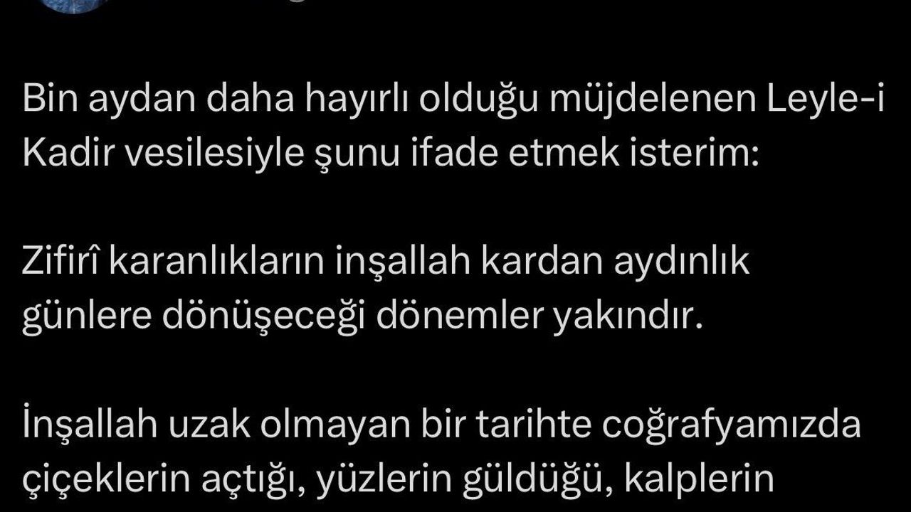 Cumhurbaşkanı Recep Tayyip Erdoğan, Kadir Gecesi'nin önemine binaen sosyal medya hesabından bir mesaj paylaştı. Mesajında, “Zifirî karanlıkların, inşallah kardan aydınlık günlere dönüşeceği dönemler yakındır” diyerek umut dolu bir mesaj verdi. Ayrıca, “İnşallah uzak olmayan bir tarihte coğrafyamızda çiçeklerin açtığı, yüzlerin güldüğü, kalplerin huzurla dolup taştığı o barış iklimini Müslümanlar olarak hep birlikte inşa edeceğiz” ifadeleriyle birlik vurgusu yaptı.
