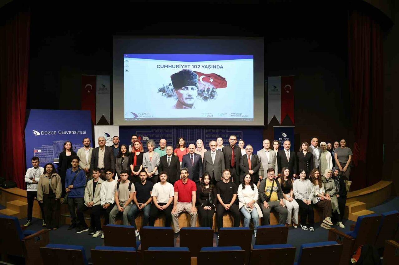 Düzce Üniversitesi Fen Edebiyat Fakültesi Tarih Bölümü tarafından, 29 Ekim Cumhuriyet Bayramı dolayısıyla “Cumhuriyet 102 Yaşında” temalı bir etkinlik düzenlendi. Yoğun bir katılımın olduğu etkinlik, Cumhuriyet Konferans Salonu’nda gerçekleştirildi. Programa Rektör Prof. Dr. Nedim Sözbir’in yanı sıra Rektör Yardımcıları Prof. Dr. İlhan Genç ve Prof. Dr. Ali Öztürk, dekanlar, akademik kadro, idari personel ve öğrenciler katıldı.