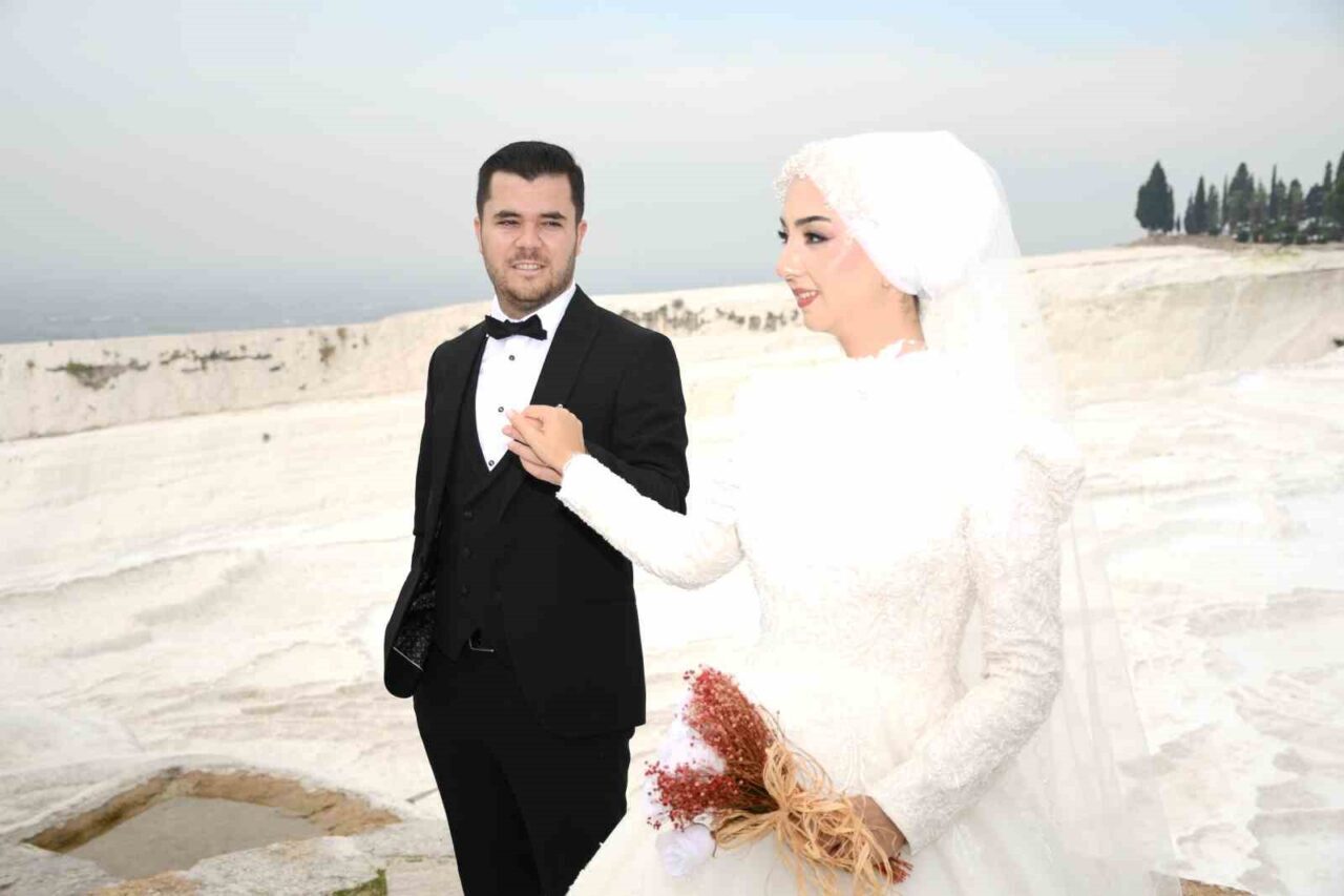Denizli’de geçtiğimiz yıl evlenen bir çift, düğün fotoğraflarından memnun kalmayınca yeniden düğün çekimi yapma kararı aldı. Bu kez, ünlü Pamukkale travertenlerinde gerçekleştirdikleri fotoğraf çekimi ile unutulmaz anlar yaşadılar.