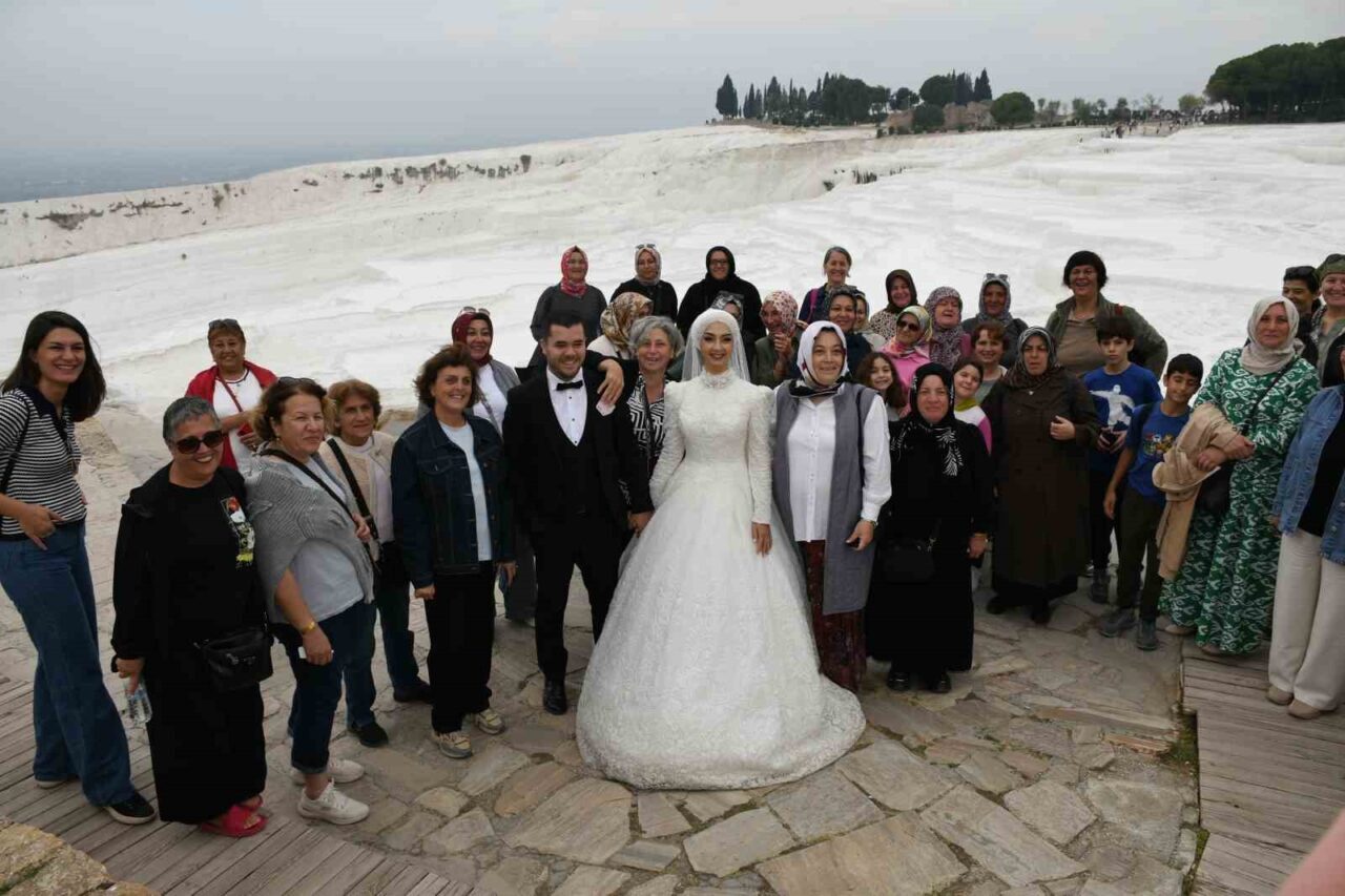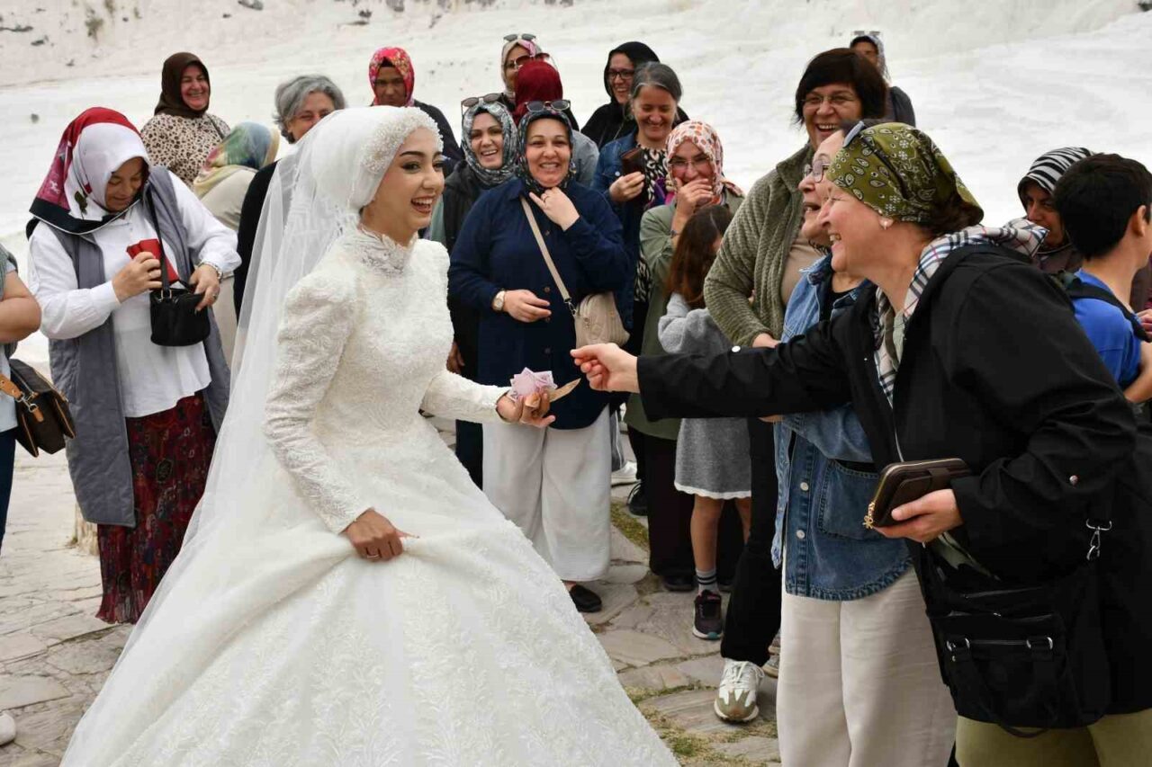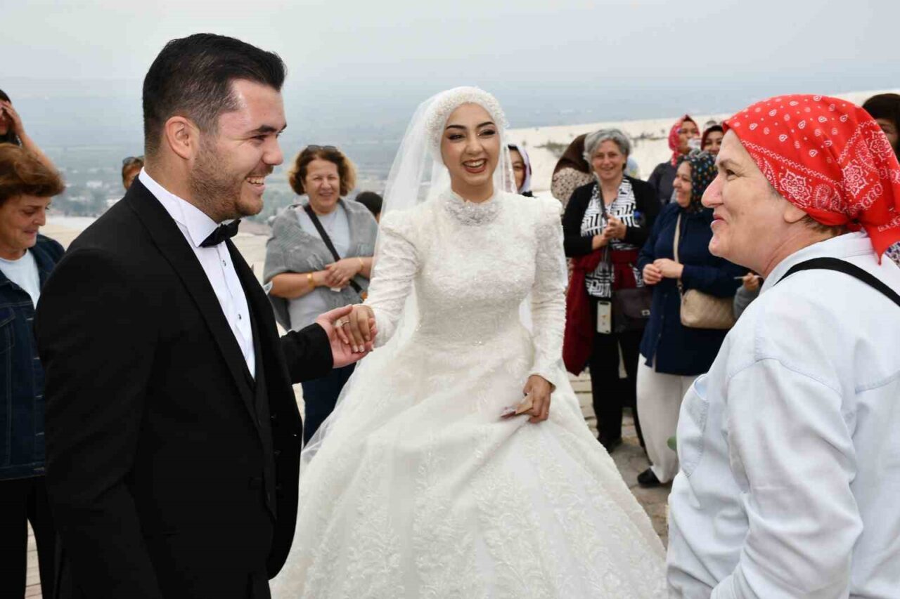 Özel bir hastanede hemşire olarak çalışan Muhammed Büke, “Eşim 6 Eylül 2023’te benimle evlendi. Düğün gününde çekimden memnun kalmadık. Eşim bir kez daha gelinlik giymek istedi. Pamukkale’de çekim yapmayı planlarken Düzceli turistlerle karşılaştık ve bu süreçte onlarla tanıştık. Ziyaretçiler, bizim düğünümüz yeni olduğu için bize takılar taktı. Çok özel bir anıydı” şeklinde konuştu.