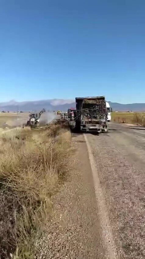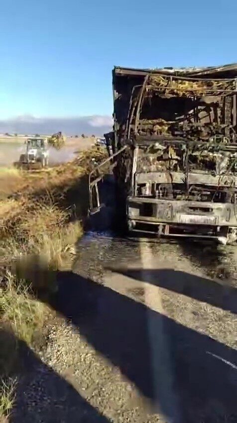 Olayın detaylarına göre, sürücüsü henüz bilinmeyen bir nedenle dorsedeki samanların tutuştuğunu fark etti. Yangını gören sürücü, alevlerin daha da yayılmadan durdurulması için kamyonu kenara çekerek müdahale etmeye çalıştı. Ancak, sürücünün tüm çabaları sonuç vermedi.