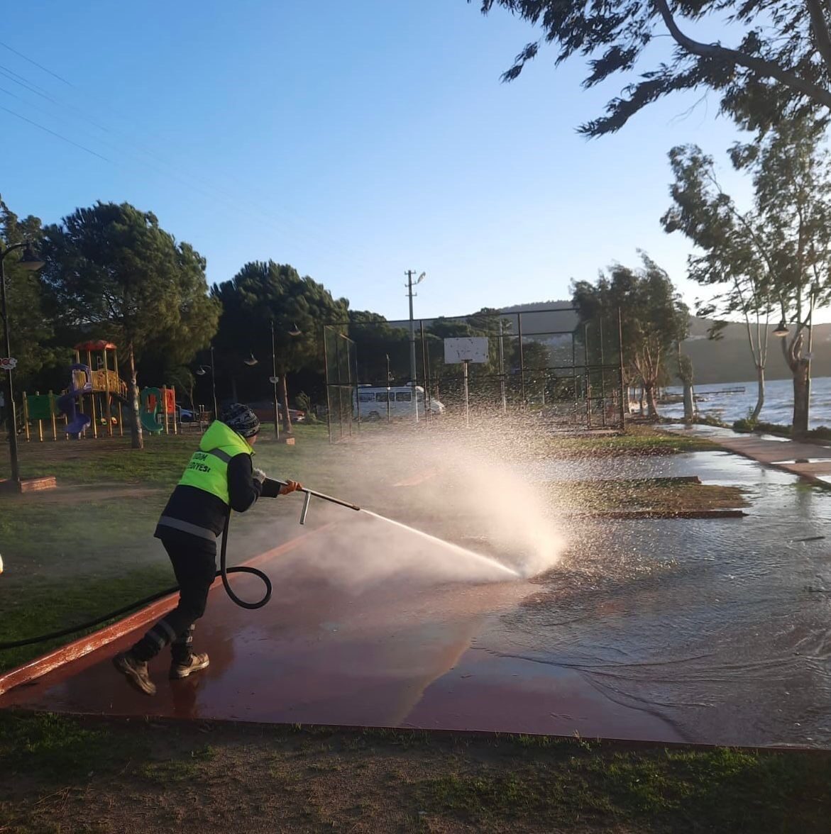 Aydın’ın Didim ilçesinde belediye ekipleri, fırtınadan zarar gören yerleri onarıyor
