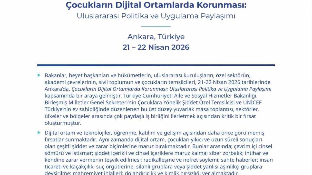 Aile ve Sosyal Hizmetler Bakanlığı ev sahipliğinde Birleşmiş Milletler Çocuk Fonu (UNICEF) ve Birleşmiş Milletler (BM) Genel Sekreteri Çocuklara Yönelik Şiddet Özel Temsilciliği iş birliğiyle 'Çocukların Dijital Ortamlarda Korunmasına İlişkin Uluslararası Politika ve Uygulama Paylaşımı' programı 21-22 Nisan'da gerçekleştirildi.