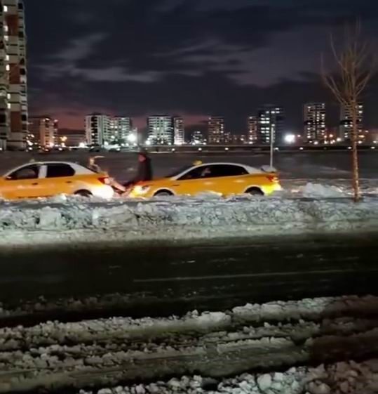 Olay Diyarbakır’ın Yenişehir ilçesinde gerçekleşti. Yolda kalan bir ticari taksiye başka bir taksinin kaputuna çıkan bir vatandaş yardım etti. Seyir halindeki aracın ilerlemesine ayaklarıyla destek veren bu vatandaşın yanında, yolda kalan aracın bagajında bir başka vatandaş öndeki araçtan yardım aldı.