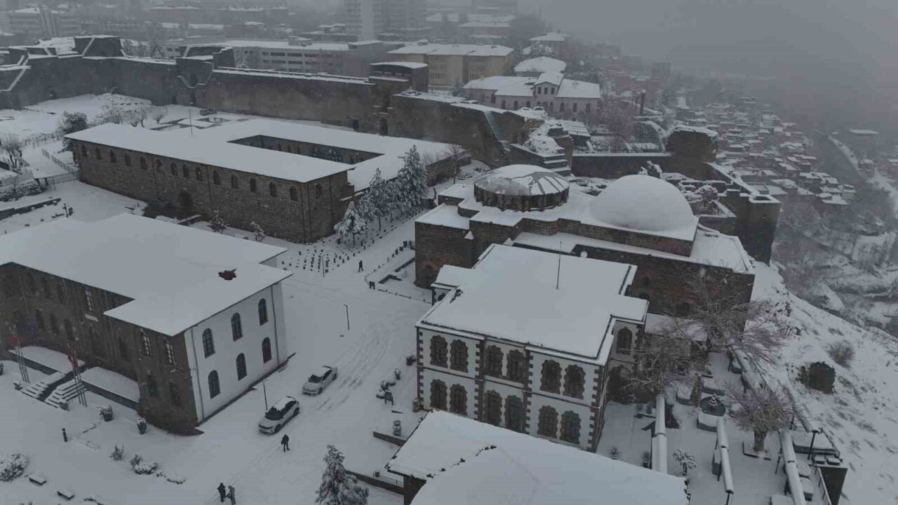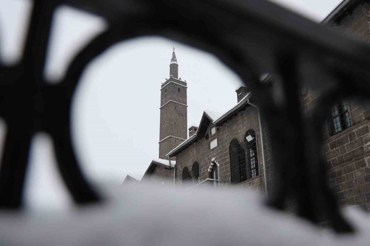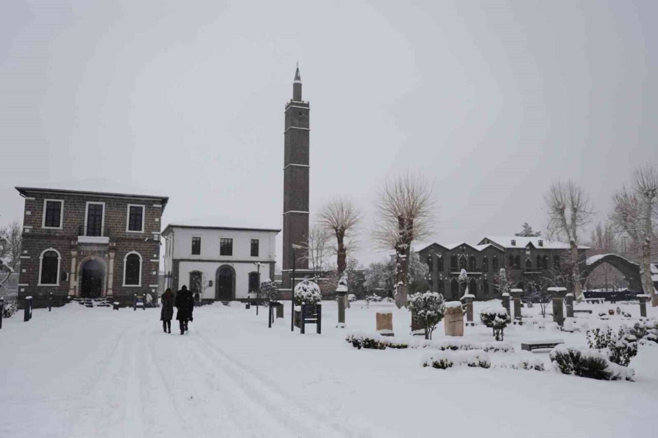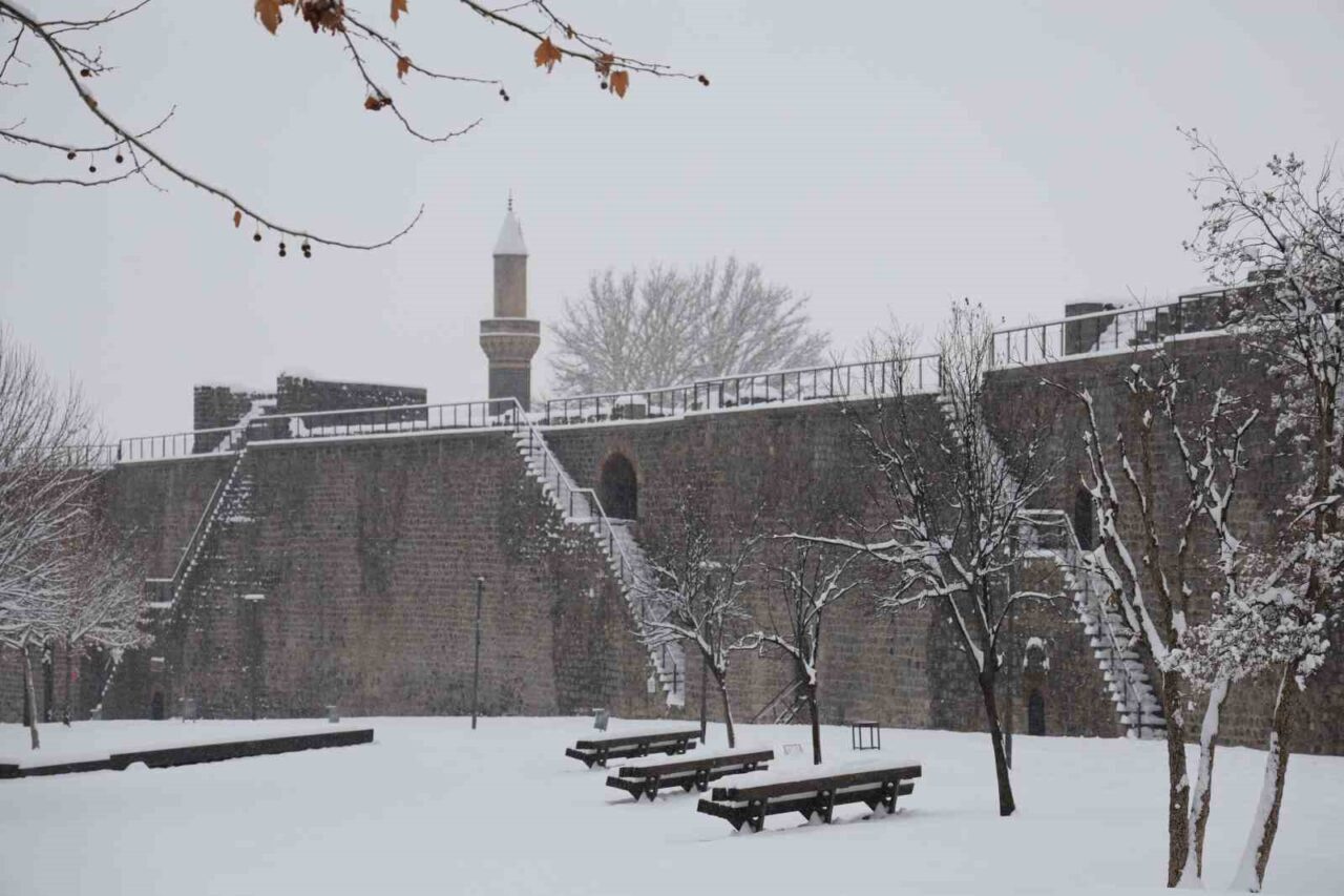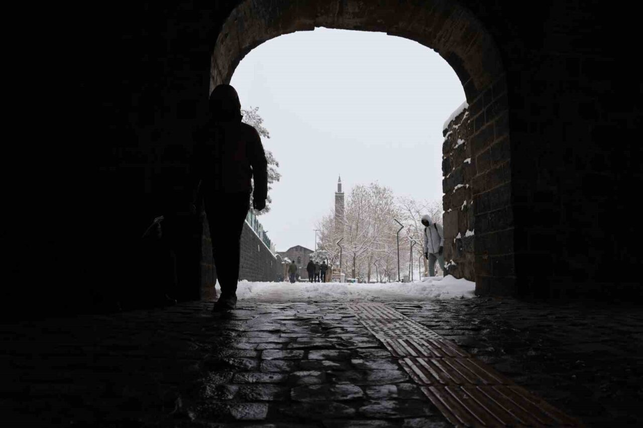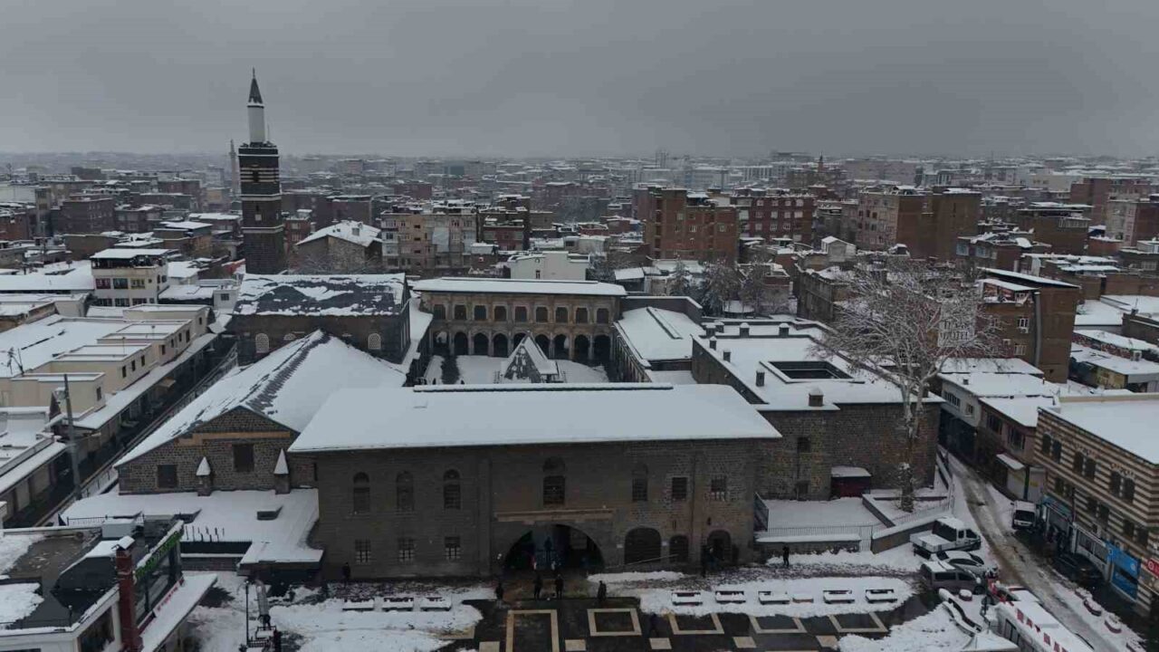 Dünyada 10 bin yıllık tarihiyle en eski ikinci yerleşim yeri olarak bilinen Diyarbakır’ın merkez Sur ilçesi beyaza bürünürken, tarihi yapılar dronla görüntülendi.
