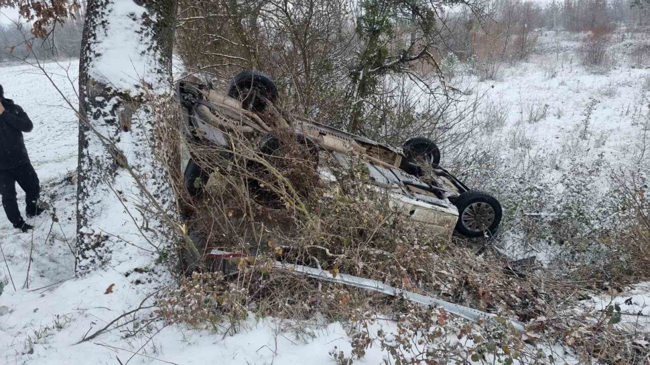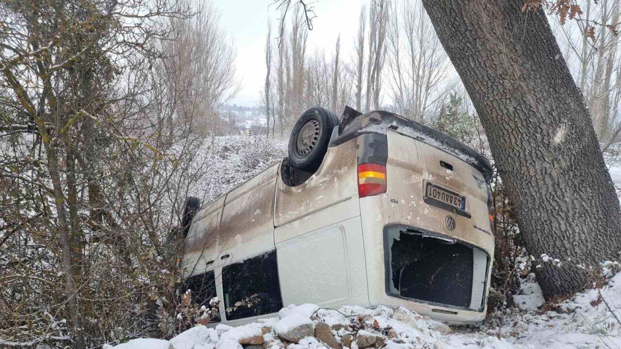 Kütahya’nın Domaniç ilçesinde gizli buzlanma nedeniyle kontrolden çıkan minibüs, şarampole düşerek takla attı. Yol kenarındaki bir ağaca çarparak durabilen araçta bulunan 2 kişi kazayı yara almadan atlattı.