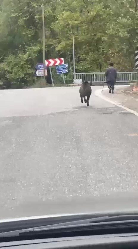Zonguldak’ın Devrek ilçesine bağlı Yağmurca köyünde ilginç bir olay yaşandı. Bir sürücünün amatör kamerasıyla kaydedilen görüntülerde, hızlıca ilerleyen bir domuzun yaşlı bir adamın üzerine doğru koştuğu anlar ortaya çıktı.