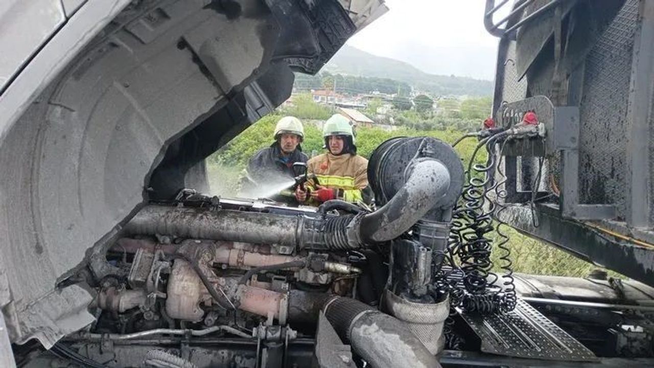 Hatay'da seyir halindeki bir tırın motor kısmında çıkan yangın, olay yerine gelen itfaiye ekipleri tarafından kontrol altına alındı.