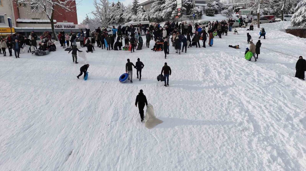Düzce’nin Bahçeşehir Bölgesi’nde yer alan Anıtpark meydanı, bu yıl da ailelerin değişilmez mekanı olmaya devam etti. Kayak için uygun alanların bulunduğu Anıtpark meydanı, Uludağ’ı aratmadı ve yüzlerce aile çocuklarıyla birlikte hem kartopu oynadı hem de kayak yaptı. Bazı vatandaşlar ise kar üzerinde halay çekerek karın tadını çıkardılar.