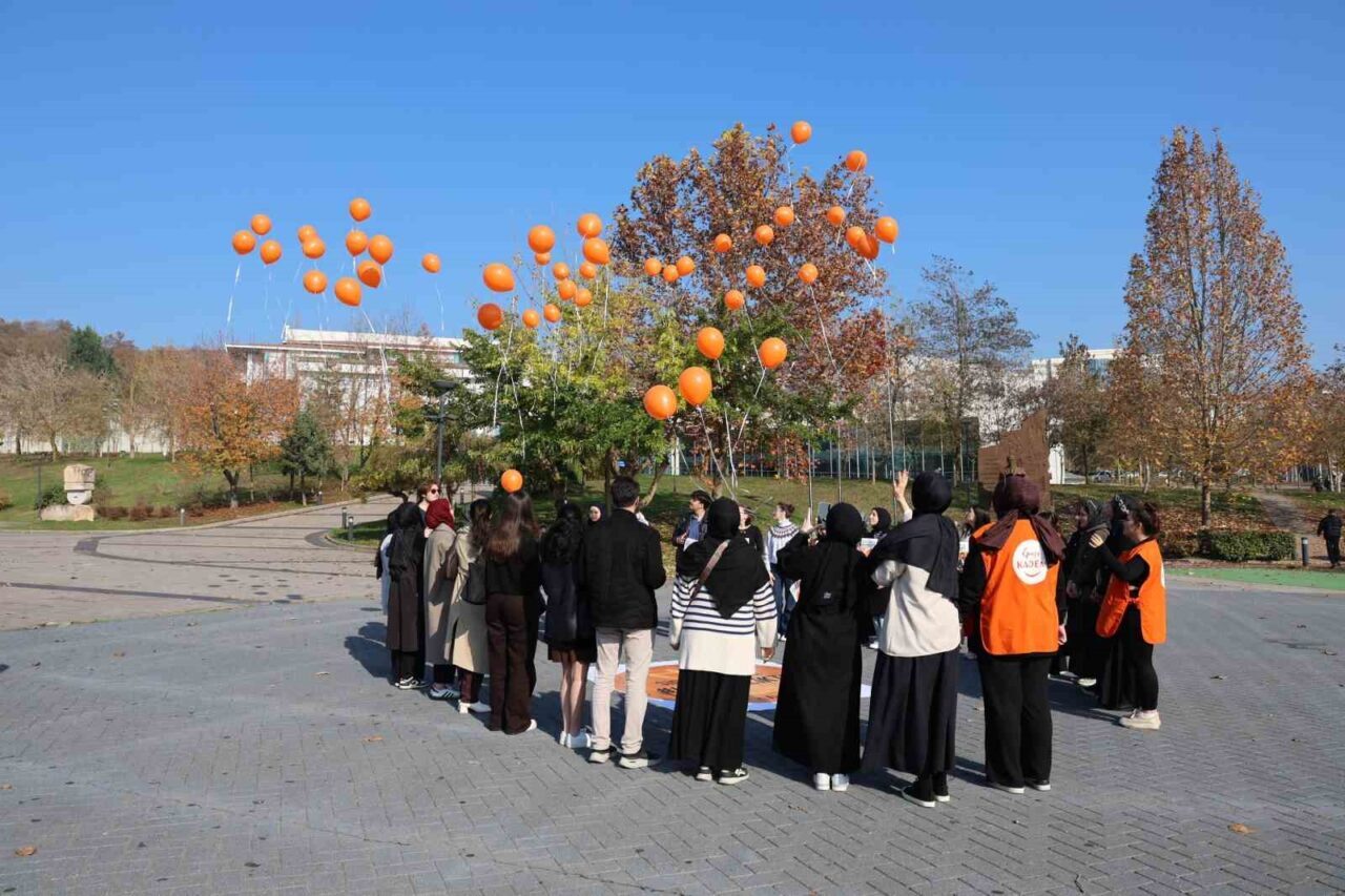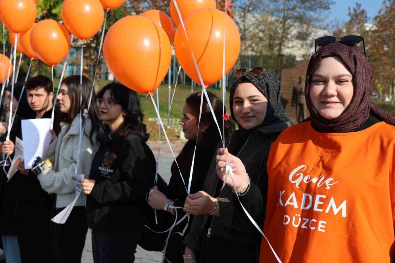 Düzce Üniversitesi’nde faaliyet gösteren Genç KADEM Topluluğu, 25 Kasım Kadına Yönelik Şiddete Karşı Uluslararası Mücadele Günü dolayısıyla farkındalık yaratmak amacıyla özel bir etkinlik düzenledi. Düzce Üniversitesi’nin 15 Temmuz Demokrasi Meydanı’nda bir araya gelen öğrenciler, kadına yönelik şiddete dikkat çekmek için turuncu balonları gökyüzüne saldı.