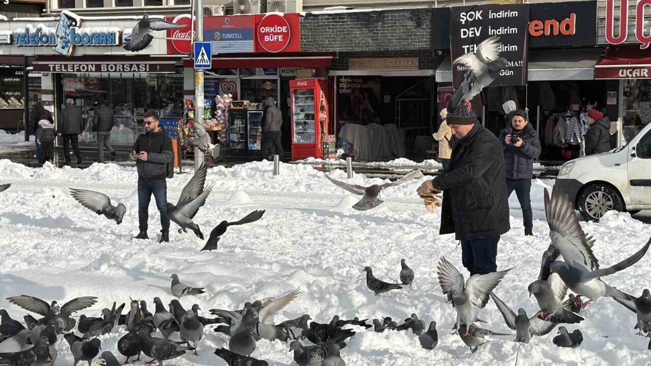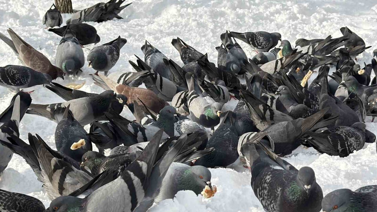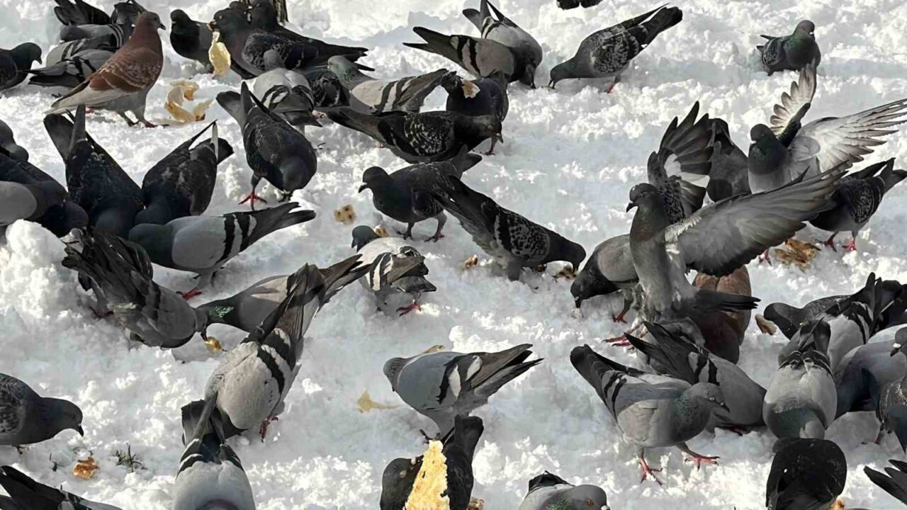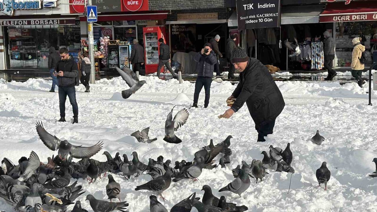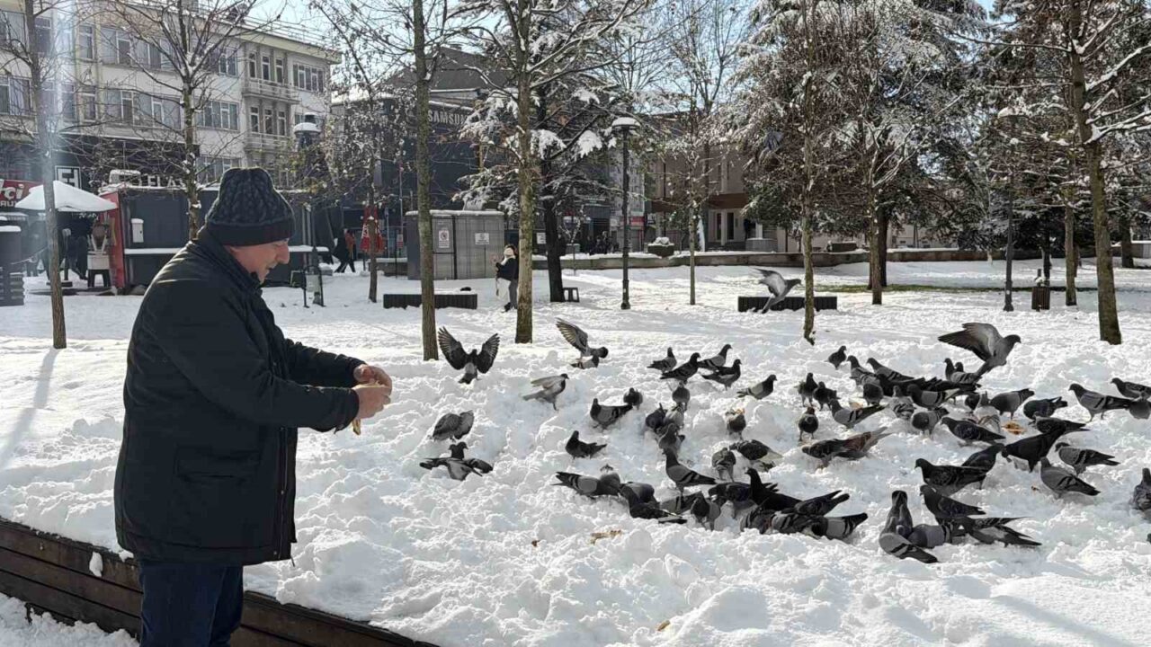 Düzce’de kar nedeniyle yemek bulmakta zorlanan güvercinleri besleyen Vedat Öztürk’ün görüntüleri yürekleri ısıttı. Düzce, 2026 yılının ilk gününe beyaz örtüyle uyandı. Yüksek kesimlerde 70 santimetreye ulaşan kar, şehir merkezinde 15 santimetreyi buldu. Kar sebebiyle yemek bulamayan güvercinlerin imdadına vatandaşlar yetişti. Millet bahçesinde güvercinleri besleyen Vedat Öztürk’ün görüntüleri yürekleri ısıttı. Konuya ilişkin gazetecilere açıklamada bulunan Öztürk, “Vesile olmuşsak ne mutlu bize. Kışın karda tabii hayvanlar da acıkmıştır. Biz de yardımcı olmak istedik, inşallah karınları doymuştur” ifadelerini kullandı.
