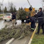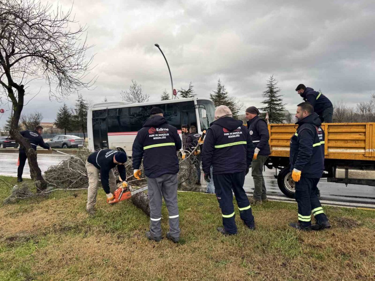 Edirne’de etkili olan fırtına, hayatı olumsuz şekilde etkilemeye devam ediyor. Saatteki hızı 60 kilometreyi bulan rüzgar nedeniyle kökünden sökülen bir ağaç, park halindeki otomobilin üzerine devrildi. Ayrıca, başka bir ağaç gövdesinden kırılarak yola düştü. Belediye ekipleri, devrilen ağaçları keserek yoldan temizleme işlemi gerçekleştirdi.