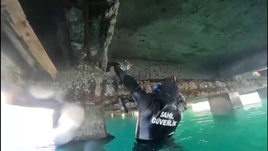 Balıkesir’in Edremit ilçesinde, denizin kenarındaki iskelenin altında mahsur kalan kedi, Sahil Güvenlik Komutanlığı’na bağlı balık adamların gerçekleştirdiği operasyonla kurtarıldı. O anlar balık adamların kafa kameralarına saniye saniye yansıdı.