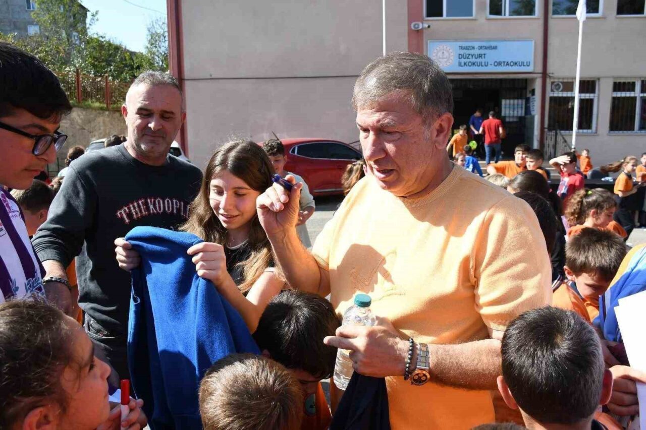 Türk futboluna damgasını vurmuş efsanevi golcü Tanju Çolak ve Hami Mandıralı, Trabzon’un Ortahisar ilçesindeki Düzyurt İlkokulu ve Ortaokulu’nda öğrencilerle bir araya geldi.