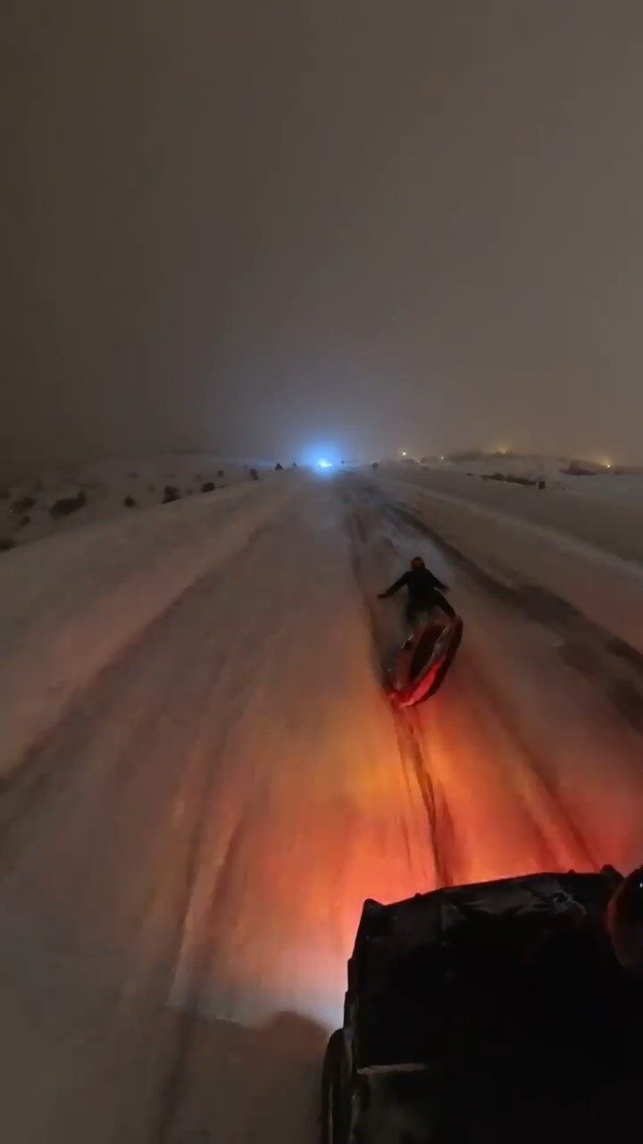 Elazığ’da kar üzerinde eğlenmek isteyen kişiler, ATV araca şişme botu bağlamaya başladı. Hıza dayanamayan botun üzerindeki şahsın bir süre sonra düştüğü anlar kameraya yansıdı.