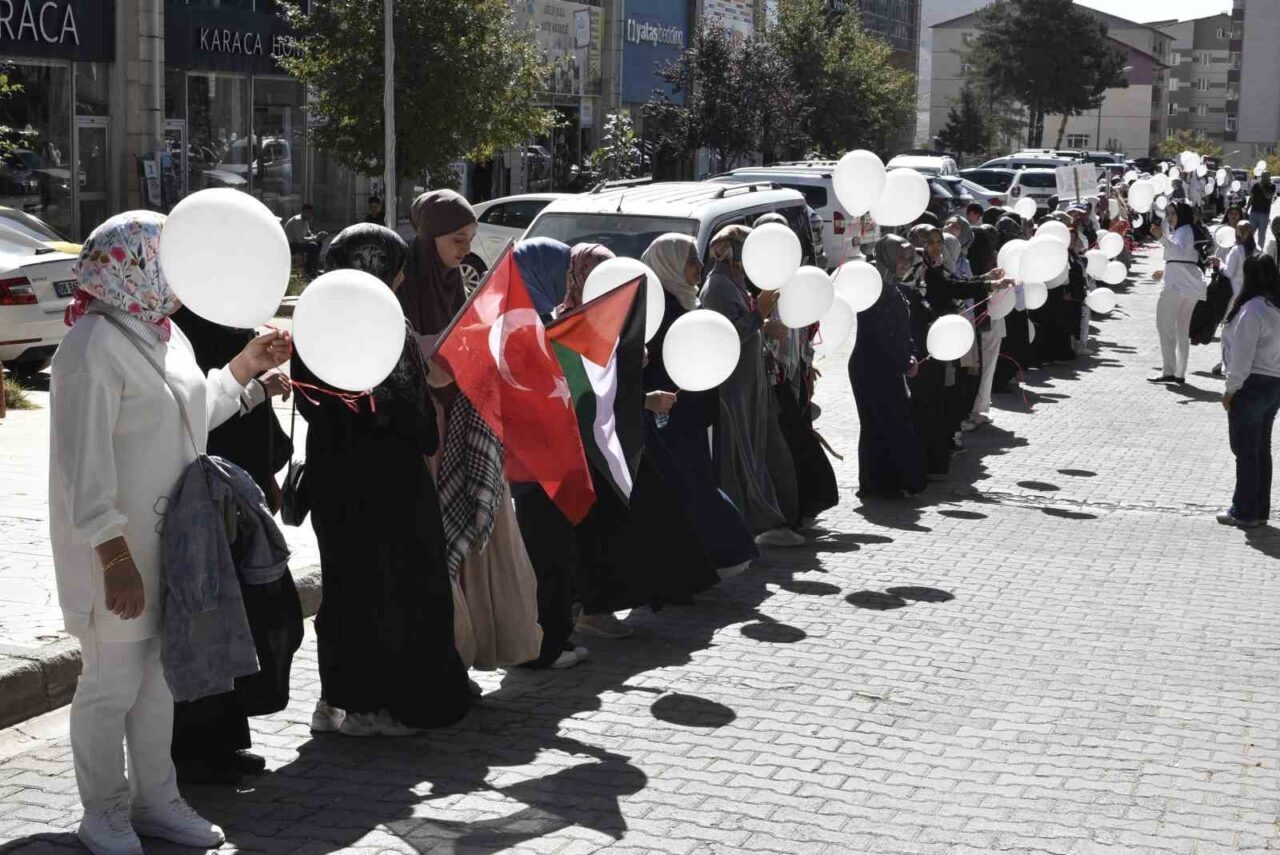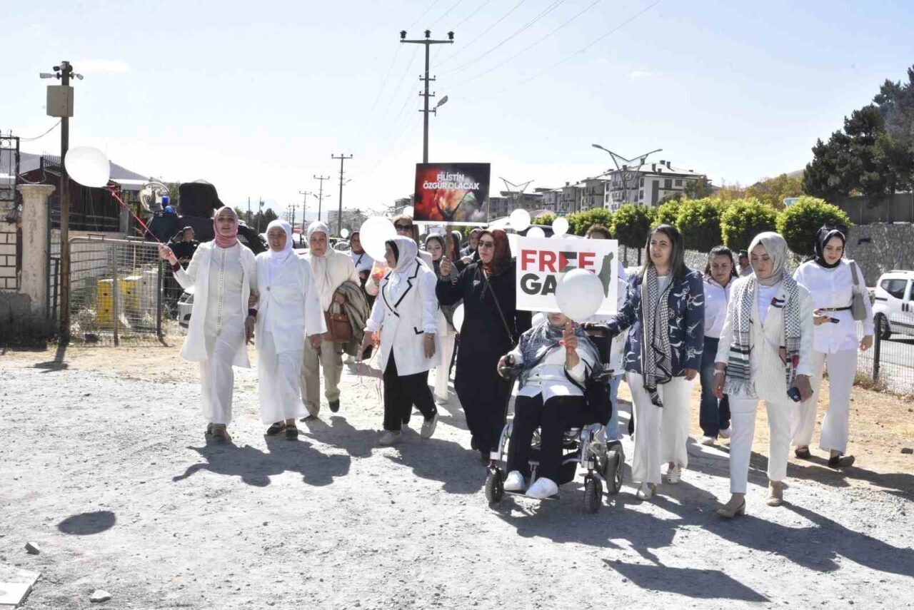 BİTLİS’TE, İSRAİL’İN GAZZE SALDIRILARINI PROTESTO ETMEK ÜZERE BİR ARAYA GELEN KADINLAR ELLERİNDE BEYAZ BALONLARLA YÜRÜYEREK BASIN AÇIKLAMASI YAPTI.