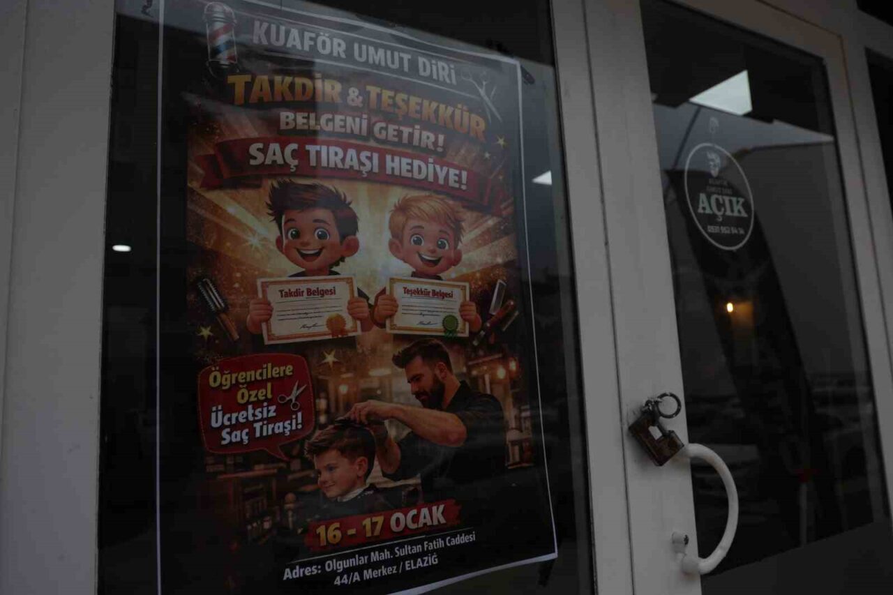 Elazığ’da erkek kuaförü Umut Diri, karne günü takdir ve teşekkür belgesi alan öğrenciler için ücretsiz tıraş kampanyası düzenledi. İki gün süren uygulama, öğrencilerden yoğun ilgi gördü. Amaçlarının çocukları motive etmek olduğunu ifade eden Kuaför Umut Diri, “Karne günü takdir ve teşekkür belgesi alan öğrencilerimizi ücretsiz tıraş ediyoruz. Amacımız çocuklarımızın başarılarını küçük de olsa bir hediyeyle taçlandırmak. Eğitim çok önemli; bu çocuklar bizim geleceğimiz. Yüzlerinde bir tebessüm oluşuyorsa, bizim için en büyük kazanç budur” dedi.