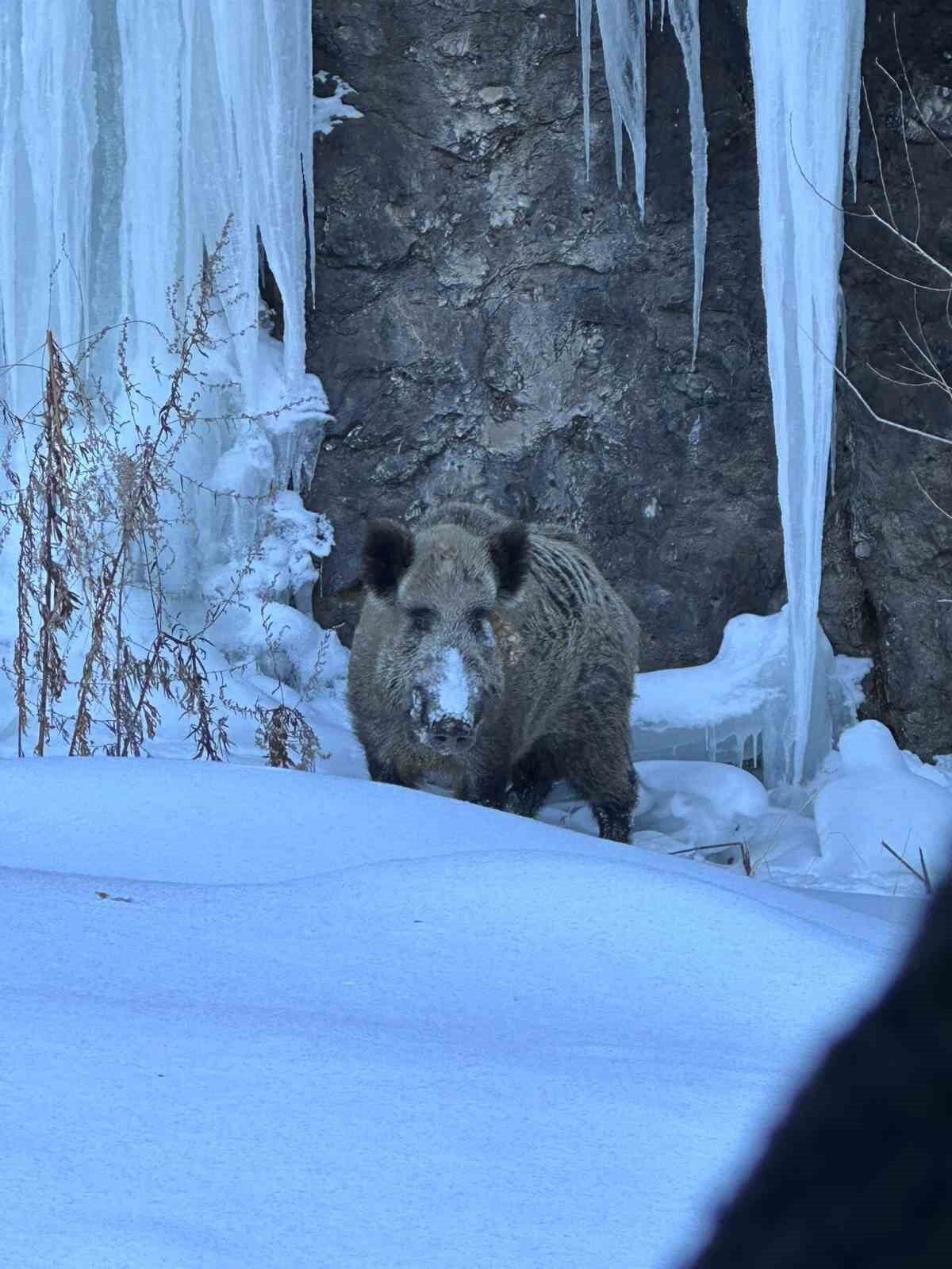 Öte yandan kar temizleme çalışmalarını tamamlayarak yol dönüşü yapan ekipler, yol üzerinde bir yaban domuzuna rastladı. Araca yol vermeyen domuz cep telefonuyla görüntülendi.