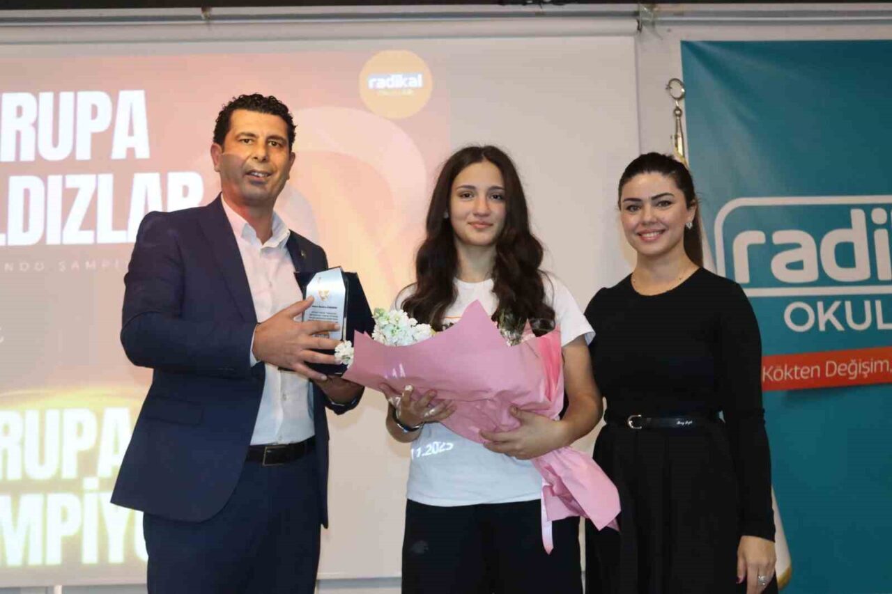 Radikal Konak Anadolu Lisesi’nde düzenlenen ödül töreninde Elif Esmira Özdirim, Yunanistan’daki Avrupa Yıldızlar Tekvando Şampiyonası’nda elde ettiği başarı ile okulunu ve ülkesini gururlandırdı. Zorlu turnuvada katıldığı dört maçı da kazanarak Avrupa şampiyonu unvanını kazanmıştı. Yönetici ve öğretmenlerin yanı sıra öğrenci arkadaşlarının da desteklediği törende, Radikal Eğitim Kurumları Genel Müdür Yardımcısı Ferhat Arslan ve Radikal Konak Anadolu Lisesi Müdürü Mutlu Kara, Elif’e plaket ve çiçek takdim etti.