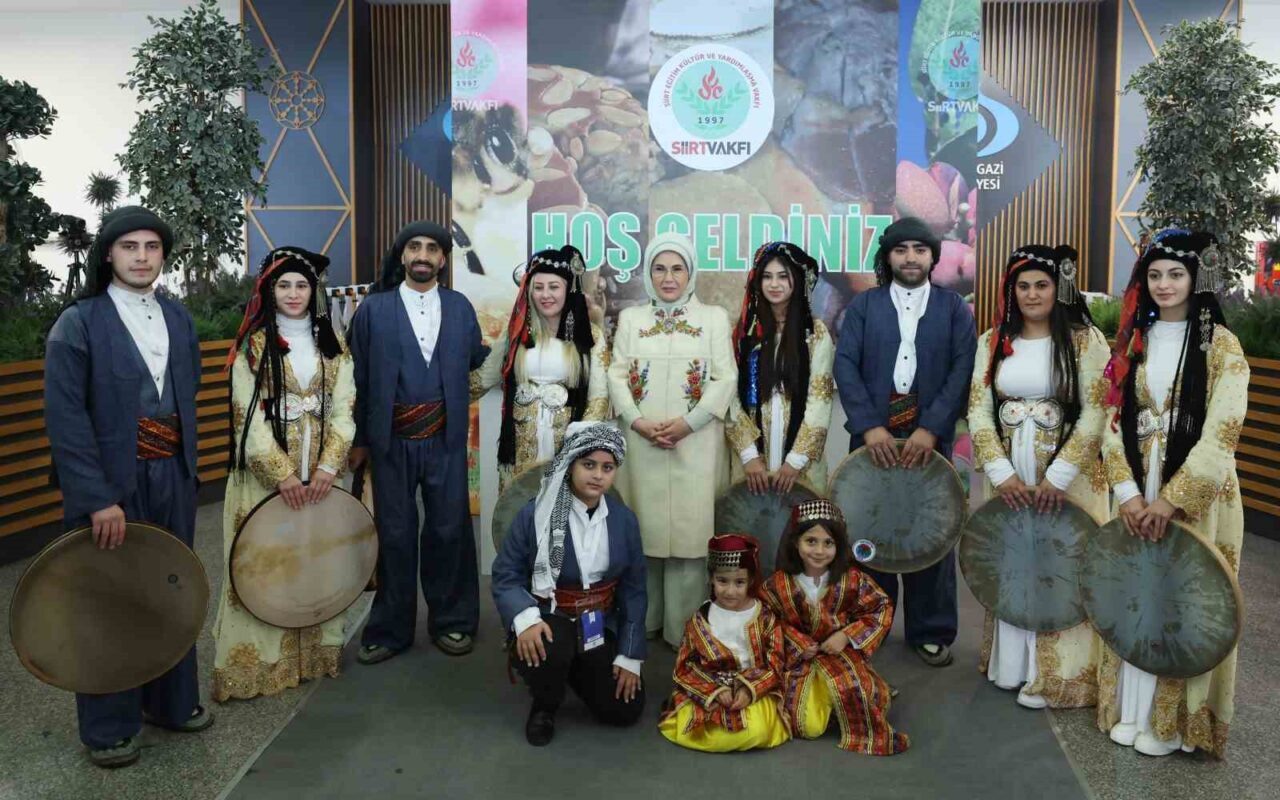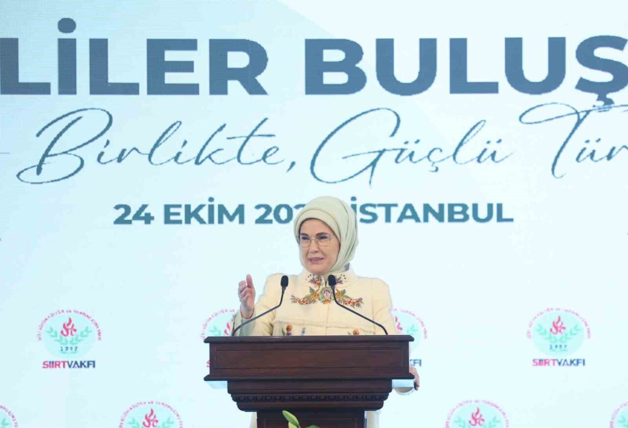 Etkinlikte Siirtli hemşehrilerine seslenen Emine Erdoğan, “Siirt, bembeyaz karlarla kaplı dağları, nar bahçeleri ve yemyeşil fıstık ağaçlarıyla büyüleyici bir yerdir. Hepimizin ortak sevgisi ve gurur kaynağıdır. Her inanç ve kültür için sıcak bir ana kucağı olan Siirt, geleneklerimizi yaşatmamızda büyük bir önem taşır. Çocukluğumun en güzel anıları ailemle yaptığımız Siirt ziyaretlerinde şekillendi. Bu ziyaretlerde misafirperverliğin ve komşuluk ilişkilerinin en güzel örneklerini gördüm. Siirtli olmaktan her zaman gurur duydum ve bugünkü projelerimin temelinin bu değerler olduğunu söyleyebilirim” ifadelerini kullandı.