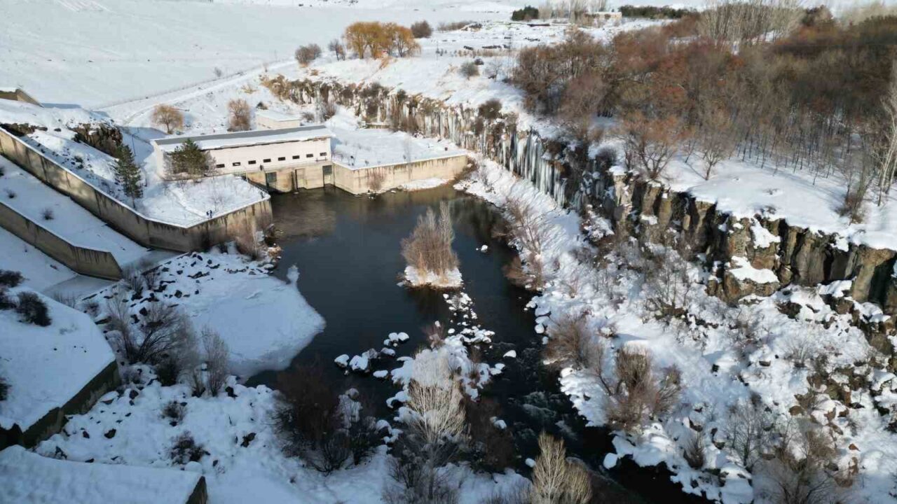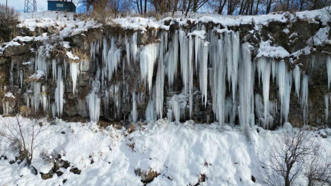 Van’ın Erciş ilçesindeki Koçköprü Kanyonu’nda oluşan metrelerce boydaki buz sarkıtları görsel şölen sunuyor.