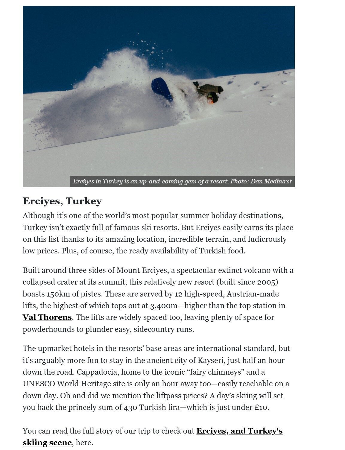 Dünyaca ünlü bir magazin dergisi, her yıl gerçekleştirdiği ’Dünyanın En İyi Kayak Merkezleri’ sıralamasını açıkladı. Bu yıl yapılan değerlendirmede, Türkiye’yi temsil eden tek merkez olarak yalnızca Erciyes Kayak Merkezi, ilk 25 kayak merkezi arasında yer aldı. Listeye Fransa, İsviçre, İtalya, ABD ve Japonya gibi önde gelen kayak ülkelerinin de dahil olduğu görülüyor. Derginin editörleri, 100’den fazla kayak merkezini çeşitli kriterler doğrultusunda değerlendirerek bu listeyi oluşturdu.