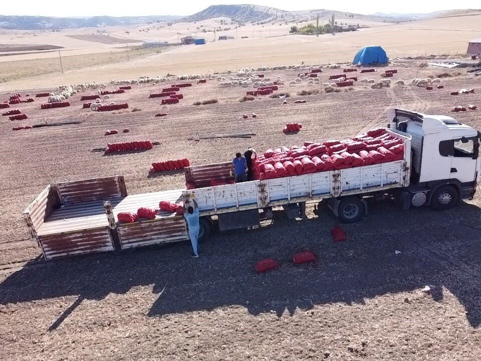 YOZGAT’IN ÇEKEREK İLÇESİNDE MOR VE SARI SOĞAN HASADI YAPAN ÜRETİCİLER İMECE USULÜYLE İŞÇİ MALİYETİNDEN, MAKİNE İLE DE ZAMANDAN TASARRUF EDİYOR.