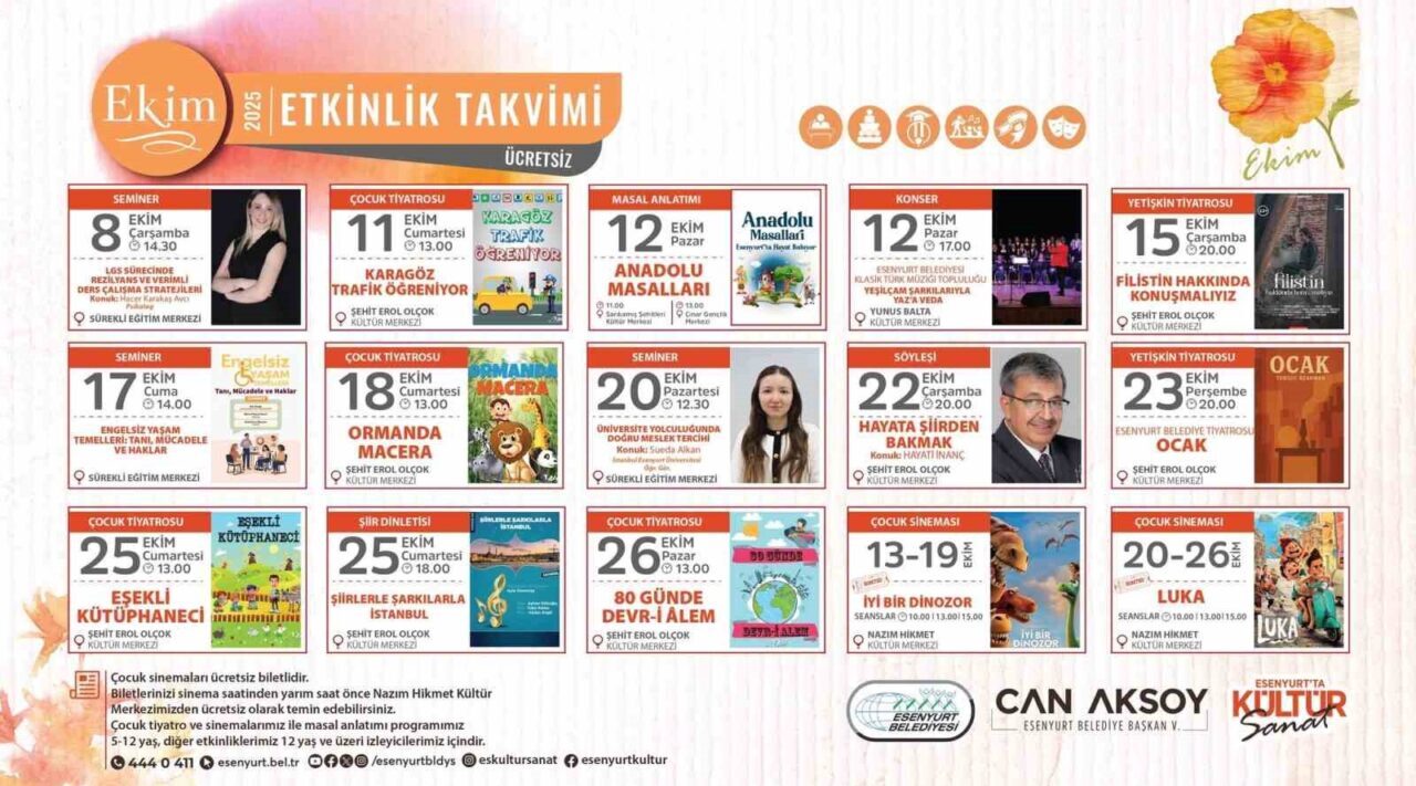 Esenyurt Belediyesi, ekim ayına özel olarak kültürel, sanatsal ve eğitici etkinliklerle dolu bir program sunuyor. Herkesin ilgi alanına hitap eden bu etkinlik takvimi, seminerlerden çocuk tiyatrolarına, şiir etkinliklerinden film gösterimlerine kadar pek çok farklı organizasyonu kapsıyor.