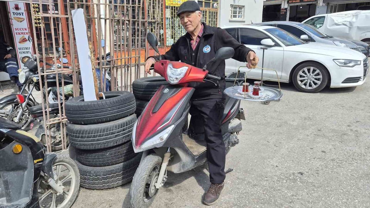 Eskişehir'de 44 yıldır çay ocağı işleten 72 yaşındaki Cahit Çandemir, bir elinde çay bardaklarıyla dolu tepsiyi tutarak diğer eliyle kullandığı elektrikli motosikletle dağıtım yapıyor. Baba mesleğini sürdürerek Eskişehir Küçük Sanayi Bölgesi'nde hizmet veren Cahit Çandemir, çevredeki işletmelere ve dükkanına gelen müşterilere hızlı bir şekilde çay servisi yapıyor. İşini kolaylaştırmak adına elektrikli bisikletle dağıtım yapmayı tercih eden Çandemir, bu yöntemle dikkat çekiyor.