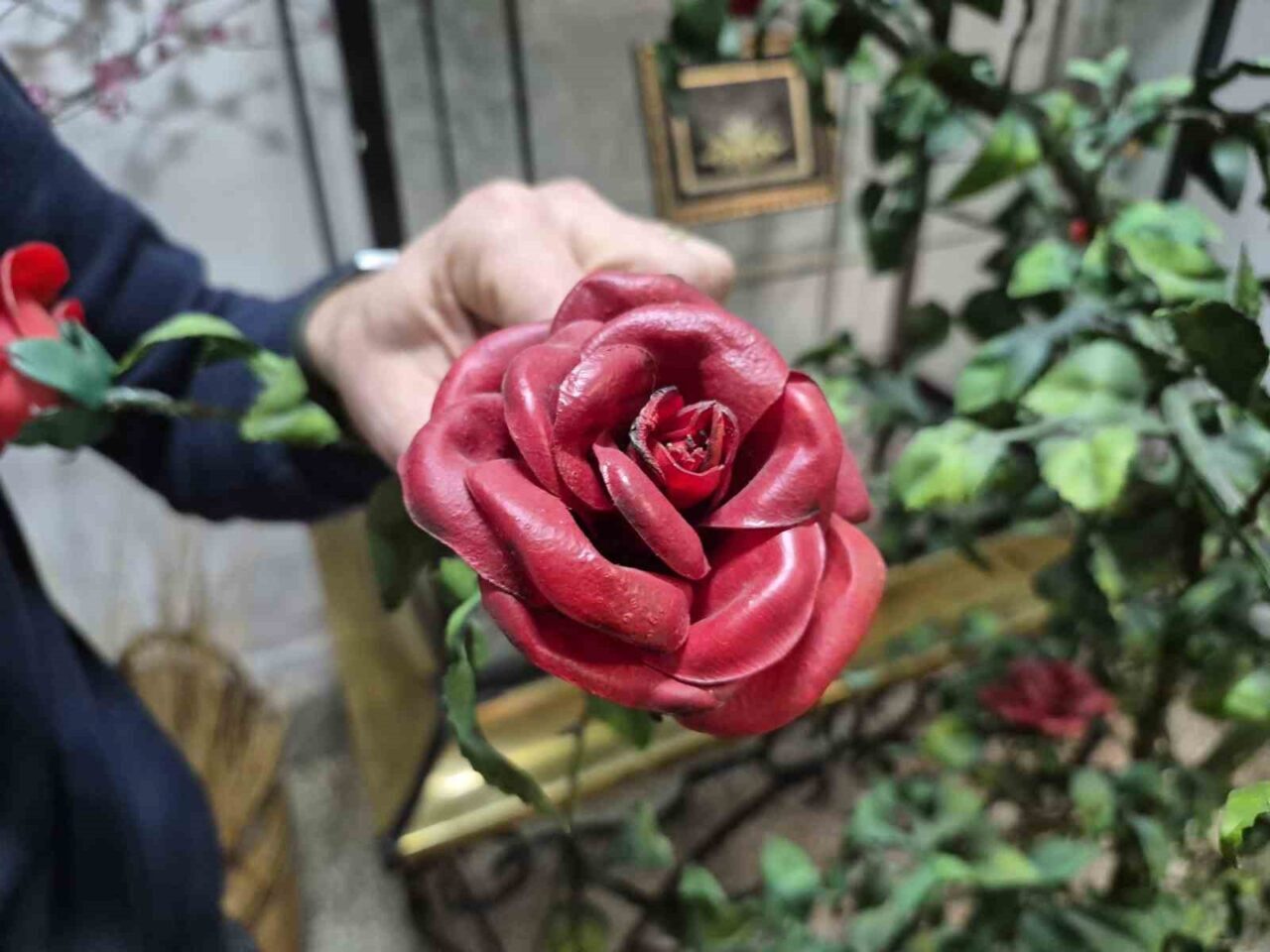 Yapım sürecinde doğal materyallerden faydalandıklarını anlatan Engin, şöyle devam etti: “Hazırladığımız bu gülleri ve yaprakları, gerçek ağaç dallarına sıcak silikon kullanarak tek tek yapıştırdık ve dizayn ettik. Ağacın kök kısmı için ise strafor kullanarak bir kütük formu oluşturduk ve üzerine gerçek ağaç kabuklarını yapıştırarak derinlik kattık. Son aşamada, gül ağacının tamamını sprey vernikle vernikleyerek tasarımı bitirdik. Bu sayede hem dayanıklılığı artırdık hem de parlak ve estetik bir görünüm elde ettik.”