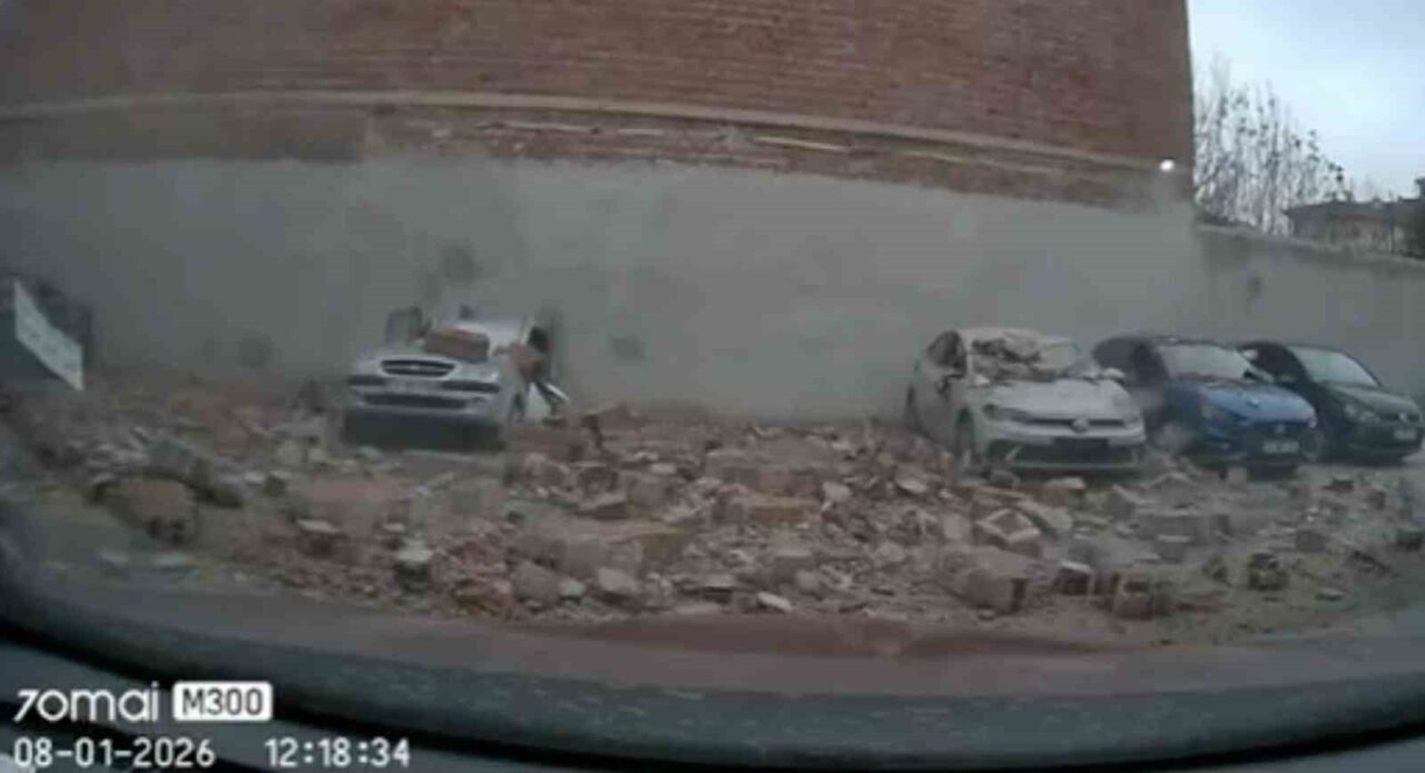 Yenibağlar Mahallesi Hacı Hüsnü Sokak’ta dünkü olay, saat 12.40 sıralarında gerçekleşti. Şiddetli rüzgar nedeniyle bir binanın çatı duvarı yanındaki otoparkın üzerine çökmüştü. Çevre sakinlerinin gürültü sebebiyle “patlama” ihbarında bulunduğu bu olay, polis ve itfaiye ekiplerinin harekete geçmesine neden oldu. Olayın ardından bugün çıkan yeni gelişmede, 6 aracın zarar gördüğü ve şans eseri yaralananın olmadığı anlar, otoparkta bulunan bir aracın kamerasına yansıdı. Ortaya çıkan görüntülerde, duvarın devrilme anı ve araçların enkazın altında kaldığı anlar yer alıyor.