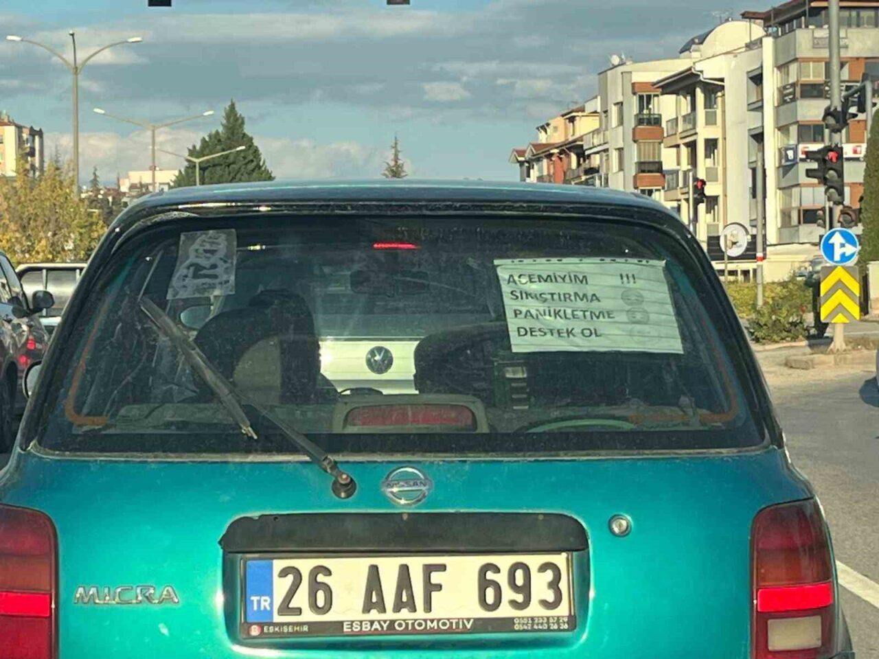 Notta, “Acemiyim, sıkıştırma, panikletme, destek ol” mesajı yazılıydı. Bu esprili yaklaşım, diğer sürücülerin yüzünde bir gülümseme oluşturdu.