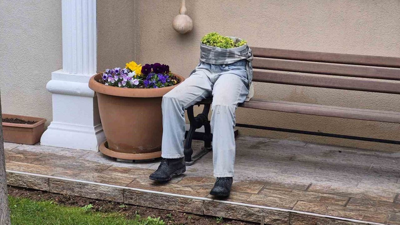 Ertuğrulgazi Mahallesi'nde, Şanver Sokak'ta bulunan bir evin bahçesinde yer alan bankın üzerine yerleştirilen bu dekorasyon, göze çarpan bir görüntü oluşturdu. Ayakkabı, pantolon ve saksının bir araya getirilmesiyle oluşturulan bu ilginç tasarım, adeta bankta oturan bir kişiyi andırıyor. İnsan figürlü saksı, hem estetik hem de korkutucu özelliğiyle, yoldan geçenlerin dikkatini çekmeyi başardı.