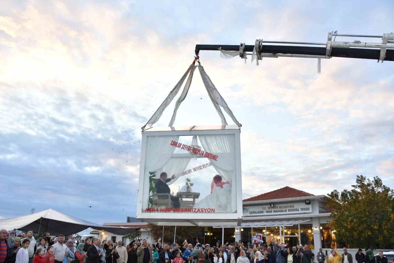 Muğla’nın Fethiye bölgesinde gerçekleşen sıradışı bir düğün organizasyonunda, gelin ve damat özel bir cam vitrin içinde şehrin caddelerinde gezdirildi. Sonrasında, düğün salonuna vinç yardımıyla indirilen çifte, unutulmaz bir gün yaşatıldı.