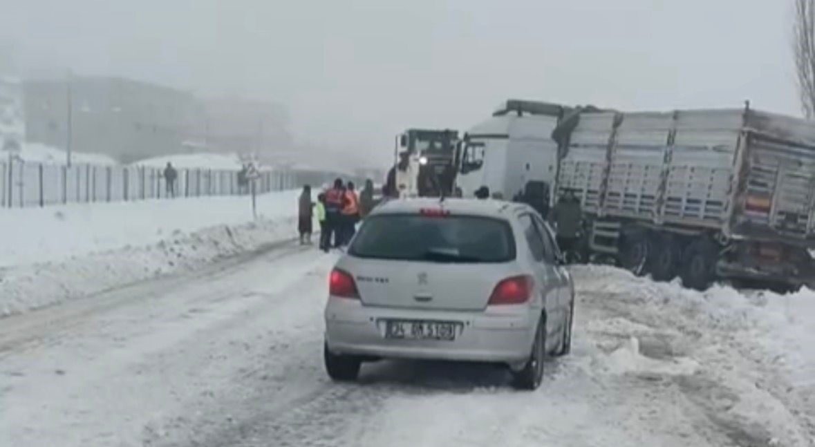 Gaziantep-Nurdağı kara yolunda yoğun kar yağışı nedeniyle kontrolden çıkarak kara saplanan tırın yolu kapatması nedeniyle trafikte kilometrelerce araç kuyruğu oluştu.