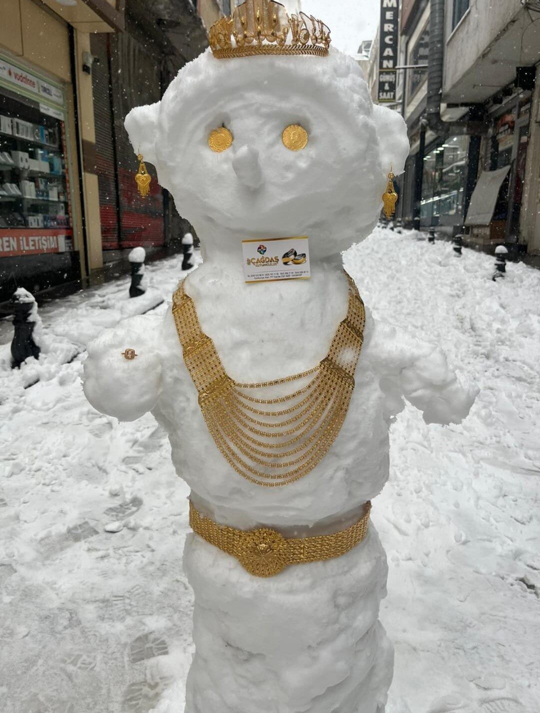 Nizip ilçesinde ise bir kuyumcu, kar yağışı nedeniyle gelen müşteri eksikliği nedeniyle iş yerinin önüne yaptığı kardan gelini altınlarla süsledi. Boynuna bilezikler ve kolyeler takılan kardan gelin, vatandaşların ilgisini çekerken renkli görüntüler ortaya çıkardı.