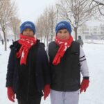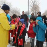 Ekipler, beyaz örtüyle kaplanan parkta çocukların soğuktan etkilenmemesi için hediyeleri dağıtırken, çocuklar da büyük bir mutluluk yaşadı.
