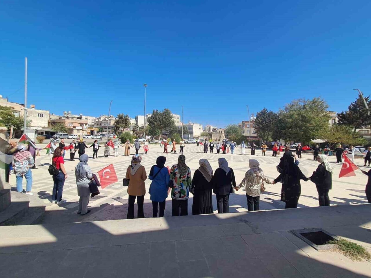 GAZZE’DE YAŞANAN ZULMÜN YIL DÖNÜMÜNDE KİLİS’TEKİ KADINLAR, RECEP TAYYİP ERDOĞAN MEYDANI’NDA BİR ARAYA GELEREK EL ELE TUTUŞUP İNSAN ZİNCİRİ OLUŞTURDU. ETKİNLİKTE FİLİSTİN HALKI İÇİN DUALAR EDİLDİ.