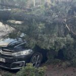 Kocaeli’nin Gebze ilçesinde fırtına nedeniyle cadde üzerindeki bir ağaç park halindeki iki otomobilin üzerine devrildi.