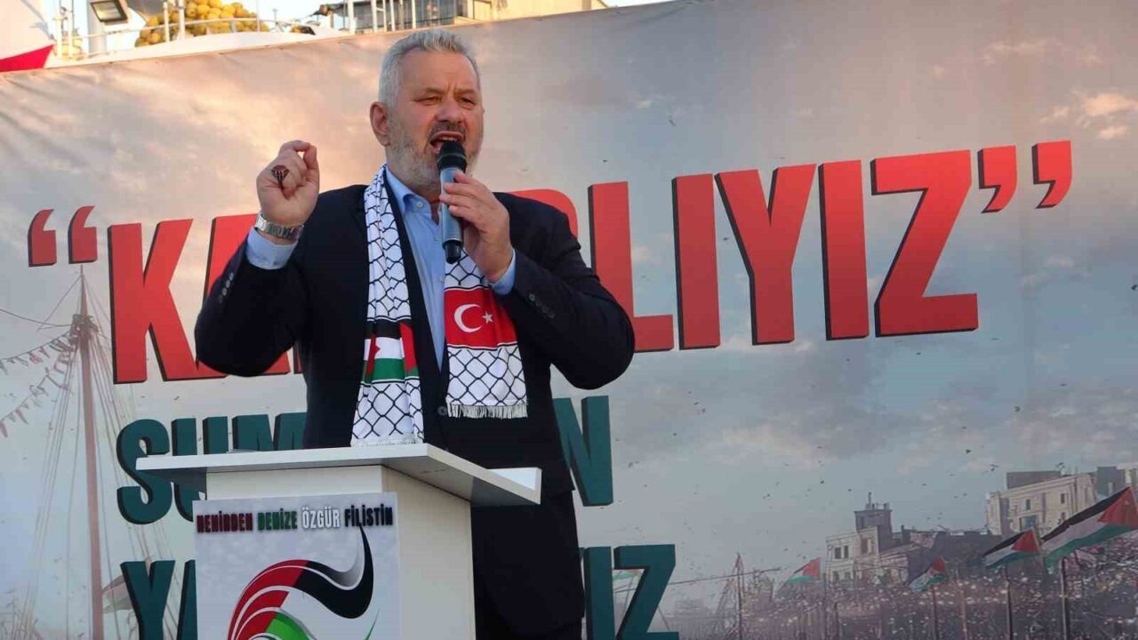 Filistin’e Destek Platformu’nun öncülüğünde gerçekleştirilen etkinlikte, Kumyalı Balıkçı Barınağı’nda bir araya gelen tekne ve gemiler, Türk ve Filistin bayraklarıyla donatıldı. Yüzlerce vatandaşın katıldığı bu anlamlı gösteriye, Giresun Valisi Mehmet Fatih Serdengeçti, AK Parti Milletvekilleri Nazım Elmas ve Ali Temür ile çeşitli siyasi parti temsilcileri ve sivil toplum kuruluşları da destek verdi.