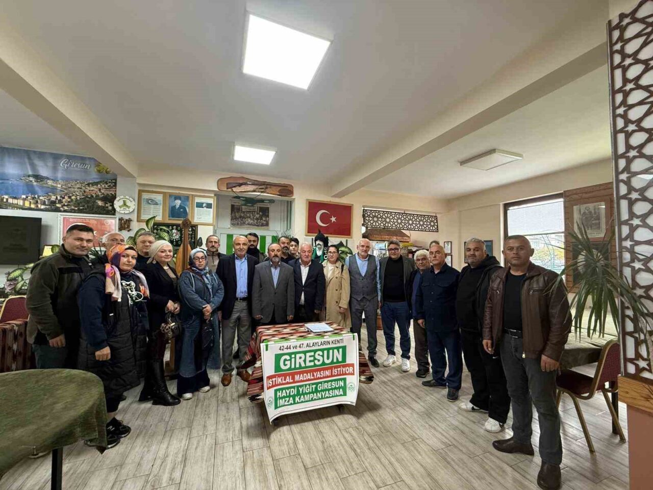 Gemlik Giresunlular Derneği Başkanı Halil Ataş ve ekibinin yer aldığı toplantıya Gemlik Belediye Başkan Yardımcısı Durmuş Uslu, iş insanı Mustafa Yiğit, Hamidiye Mahallesi Muhtarı Mehmet Çiçek, TR Düşünce Kulübü temsilcisi Gencay Yılmaz, basın mensupları ve çok sayıda dernek üyesi katılım gösterdi. Halil Ataş, “Giresun’un onuru için toplandık. Esnaf ve Sanatkarlar Odaları Birliği Başkanımız Ali Kara’nın liderliğinde; 42., 44. ve 47. Gönüllü Alaylar adına şehrimize İstiklal Madalyası ve ‘Yiğit’ unvanının verilmesi için başlattığımız imza kampanyasında hemşehrilerimizin desteklerini rica ediyoruz” dedi.