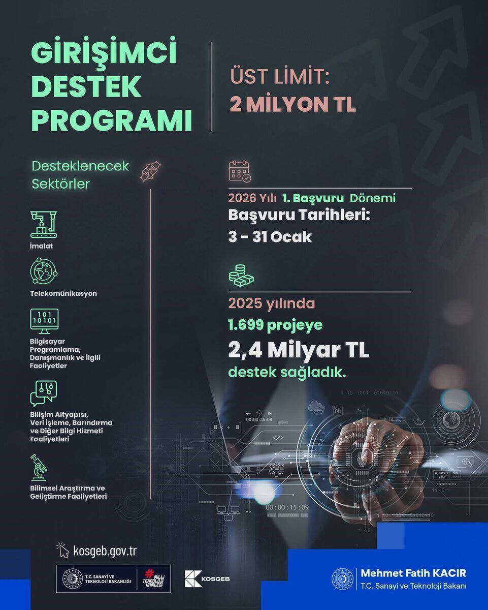 Program çerçevesinde 2 milyon liraya kadar destek sunulduğunu vurgulayan Bakan Kacır, şunları ifade etti: “Girişimcilerimize 2 milyon liraya kadar destek sağlıyoruz. KOSGEB Girişimci Destek Programı İş Geliştirme Desteği ile imalat, bilişim ve bilimsel araştırma alanlarında faaliyet gösteren girişimcilerimizin, personel, yazılım, makine-teçhizat ve kalıp, hizmet alımı giderlerine katkıda bulunuyoruz. 2025 yılında bin 699 proje için 2,4 milyar lira destekleme kararı aldık. 2026’da daha fazla girişimcimizi üretime, yeniliğe ve güçlü bir geleceğe taşımayı hedefliyoruz.”