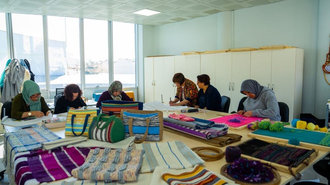 Gölbaşı Belediyesi Paylaşım Noktası'na ulaşan atıl malzemeler, Zübeyde Hanım Aile Yaşam Merkezi'nde kursiyerlerin emeğiyle tekrar hayat buluyor. Gölbaşı Belediyesi, ömrünü tamamlamış veya kullanılmayan malzemeleri titizlikle ayrıştırarak yeniden değerlendirme sürecine alıyor. Bu malzemeler, sökülerek iplik haline getirilmekte ve dokuma üretiminde kullanılmak üzere çözgü ve atkı ipliklerine dönüştürülmektedir.
