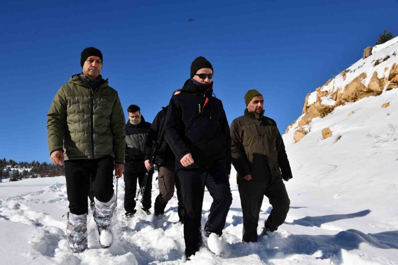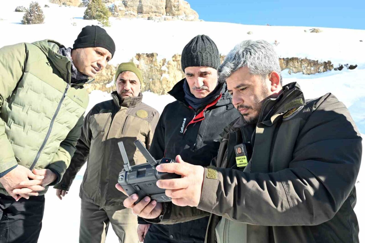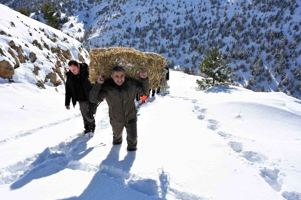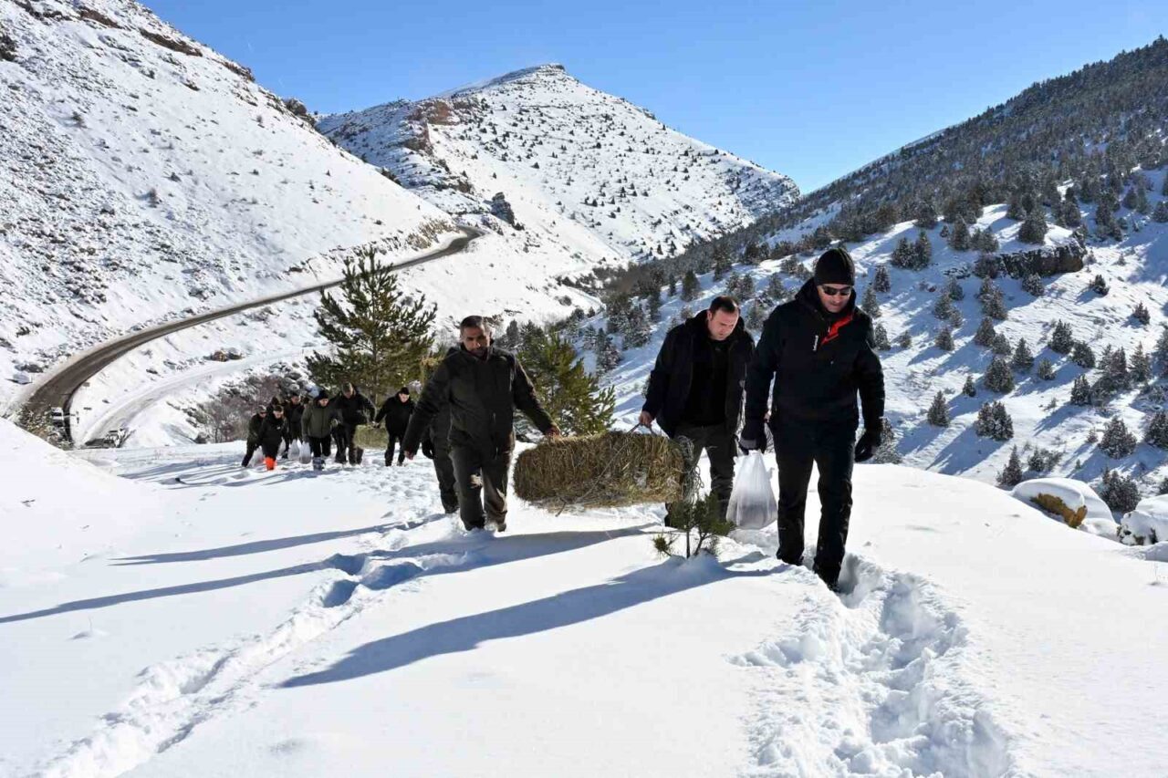 Yoğun kar nedeniyle yiyecek bulmakta zorluk çeken yaban hayvanları için doğada uygun noktalara ot ve buğday bırakıldı. Ekiplerle birlikte karla kaplı alanda ot ve buğday çuvallarını taşıyan Vali Aydın Baruş, bu malzemeleri başta yaban keçileri olmak üzere yaban hayvanlarının kolayca ulaşabileceği ve güvenle beslenebileceği alanlara bırakmayı sağladı.
