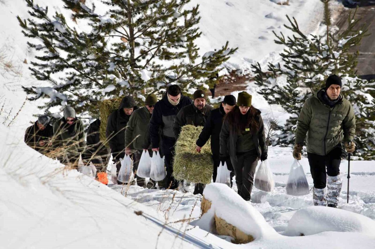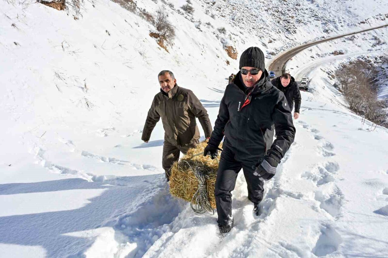 Yoğun kar nedeniyle yiyecek bulmakta zorluk çeken yaban hayvanları için doğada uygun noktalara ot ve buğday bırakıldı. Ekiplerle birlikte karla kaplı alanda ot ve buğday çuvallarını taşıyan Vali Aydın Baruş, bu malzemeleri başta yaban keçileri olmak üzere yaban hayvanlarının kolayca ulaşabileceği ve güvenle beslenebileceği alanlara bırakmayı sağladı.