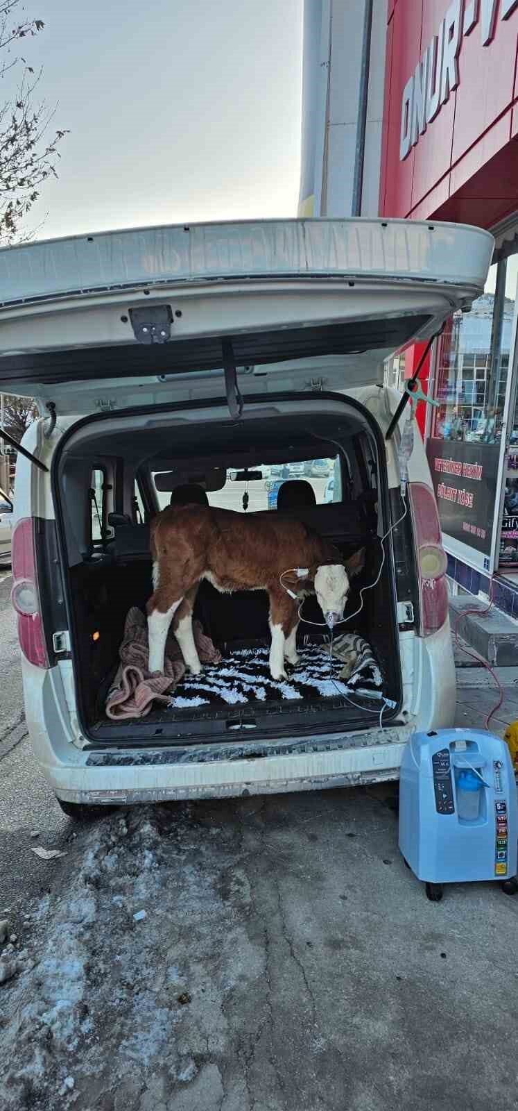 Sivas’ın Gürün ilçesinde, ısınması için ahırda yakılan ateş sonucunda karbonmonoksit gazından zehirlenen 6 günlük buzağıya otomobilin bagajında acil müdahale yapıldı.